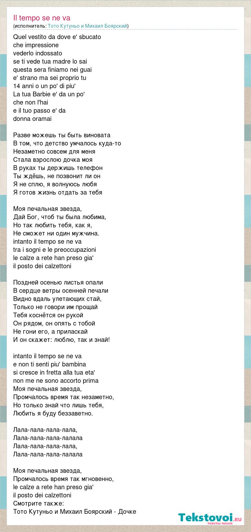 Quel vestito da dove e' sbucato che impressione vederlo indossato se ti vede tua madre lo sai questa sera finiamo nei guai e' strano ma sei proprio tu 14 anni o un po' di piu' La tua Barbie e' da un po' che non l'hai e il tuo passo e' da donna oramai Разве можешь ты быть виновата В том, что детство умчалось куда-то Незаметно совсем для меня Стала взрослою дочка моя В руках ты держишь телефон Ты ждёшь, не позвонит ли он Я не сплю, я волнуюсь любя Я готов жизнь отдать за тебя Моя печальная звезда, Дай Бог, чтоб ты была любима, Но так любить тебя, как я, Не сможет ни один мужчина. intanto il tempo se ne va tra i sogni e le preoccupazioni le calze a rete han preso gia' il posto dei calzettoni Поздней осенью листья опали В сердце ветры осенней печали Видно вдаль улетающих стай, Только не говори им прощай Тебя коснётся он рукой Он рядом, он опять с тобой Не гони его, а приласкай И он скажет: люблю, так и знай! intanto il tempo se ne va e non ti senti piu' bambina si cresce in fretta alla tua eta' non me ne sono accorto prima Моя печальная звезда, Промчалось время так незаметно, Но только знай что лишь тебя, Любить я буду беззаветно. Лала-лала-лала-лала, Лала-лала-лала-лалала Лала-лала-лала-лала, Лала-лала-лала-лалала Моя печальная звезда, Промчалось время так мгновенно, le calze a rete han preso gia' il posto dei calzettoni Смотрите также: Тото Кутуньо и Михаил Боярский - Дочке