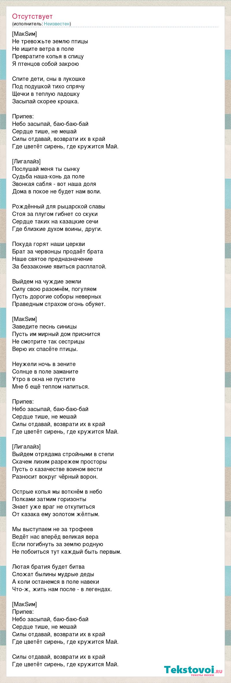 [МакSим] Не тревожьте землю птицы Не ищите ветра в поле Превратите копья в спицу Я птенцов собой закрою Спите дети, сны в лукошке Под подушкой тихо спрячу Щечки в теплую ладошку Засыпай скорее крошка. Припев: Небо засыпай, баю-баю-бай Сердце тише, не мешай Силы отдавай, возврати их в край Где цветёт сирень, где кружится Май. [Лигалайз] Послушай меня ты сынку Судьба наша-конь да поле Звонкая сабля - вот наша доля Дома в покое не будет нам воли. Рождённый для рыцарской славы Стоя за плугом гибнет со скуки Сердце таких на казацкие сечи Где близкие духом воины, други. Покуда горят наши церкви Брат за червонцы продаёт брата Наше святое предназначение За беззаконие явиться расплатой. Выйдем на чуждие земли Силу свою разомнём, погуляем Пусть дорогие соборы неверных Праведным страхом огонь обуяет. [МакSим] Заведите песнь синицы Пусть им мирный дом приснится Не смотрите так сестрицы Верю их спасёте птицы. Неужели ночь в зените Солнце в поле заманите Утро в окна не пустите Мне б ещё теплом напиться. Припев: Небо засыпай, баю-баю-бай Сердце тише, не мешай Силы отдавай, возврати их в край Где цветёт сирень, где кружится Май. [Лигалайз] Выйдем отрядама стройными в степи Скачем лихим разрежем просторы Пусть о казачестве воином вести Разносит вокруг чёрный ворон. Острые копья мы воткнём в небо Полками затмим горизонты Знает уже враг не откупиться От казака ему золотом жёлтым. Мы выступаем не за трофеев Ведёт нас вперёд великая вера Если погибнуть за землю родную Не побоиться тут каждый быть первым. Лютая братия будет битва Сложат былины мудрые деды А коли останемся в поле навеки Что-ж, жить нам после - в легендах. [МакSим] Припев: Небо засыпай, баю-баю-бай Сердце тише, не мешай Силы отдавай, возврати их в край Где цветёт сирень, где кружится Май. Силы отдавай, возврати их в край Где цветёт сирень, где кружится Май.