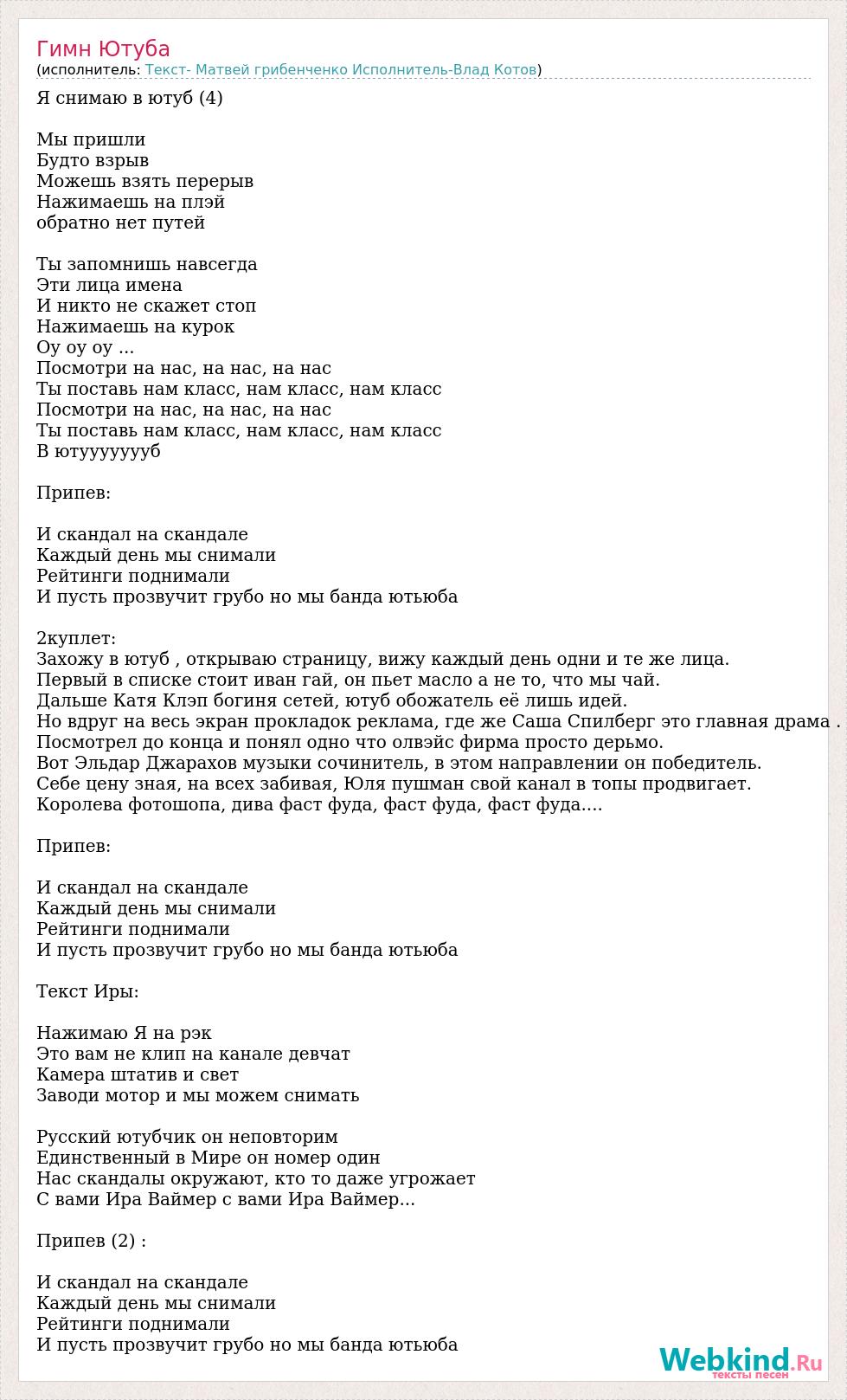 Я снимаю в ютуб (4) Мы пришли Будто взрыв Можешь взять перерыв Нажимаешь на плэй обратно нет путей Ты запомнишь навсегда Эти лица имена И никто не скажет стоп Нажимаешь на курок Оу оу оу ... Посмотри на нас, на нас, на нас Ты поставь нам класс, нам класс, нам класс Посмотри на нас, на нас, на нас Ты поставь нам класс, нам класс, нам класс В ютуууууууб Припев: И скандал на скандале Каждый день мы снимали Рейтинги поднимали И пусть прозвучит грубо но мы банда ютьюба 2куплет: Захожу в ютуб , открываю страницу, вижу каждый день одни и те же лица. Первый в списке стоит иван гай, он пьет масло а не то, что мы чай. Дальше Катя Клэп богиня сетей, ютуб обожатель её лишь идей. Но вдруг на весь экран прокладок реклама, где же Саша Спилберг это главная драма . Посмотрел до конца и понял одно что олвэйс фирма просто дерьмо. Вот Эльдар Джарахов музыки сочинитель, в этом направлении он победитель. Себе цену зная, на всех забивая, Юля пушман свой канал в топы продвигает. Королева фотошопа, дива фаст фуда, фаст фуда, фаст фуда.... Припев: И скандал на скандале Каждый день мы снимали Рейтинги поднимали И пусть прозвучит грубо но мы банда ютьюба Текст Иры: Нажимаю Я на рэк Это вам не клип на канале девчат Камера штатив и свет Заводи мотор и мы можем снимать Русский ютубчик он неповторим Единственный в Мире он номер один Нас скандалы окружают, кто то даже угрожает С вами Ира Ваймер с вами Ира Ваймер... Припев (2) : И скандал на скандале Каждый день мы снимали Рейтинги поднимали И пусть прозвучит грубо но мы банда ютьюба