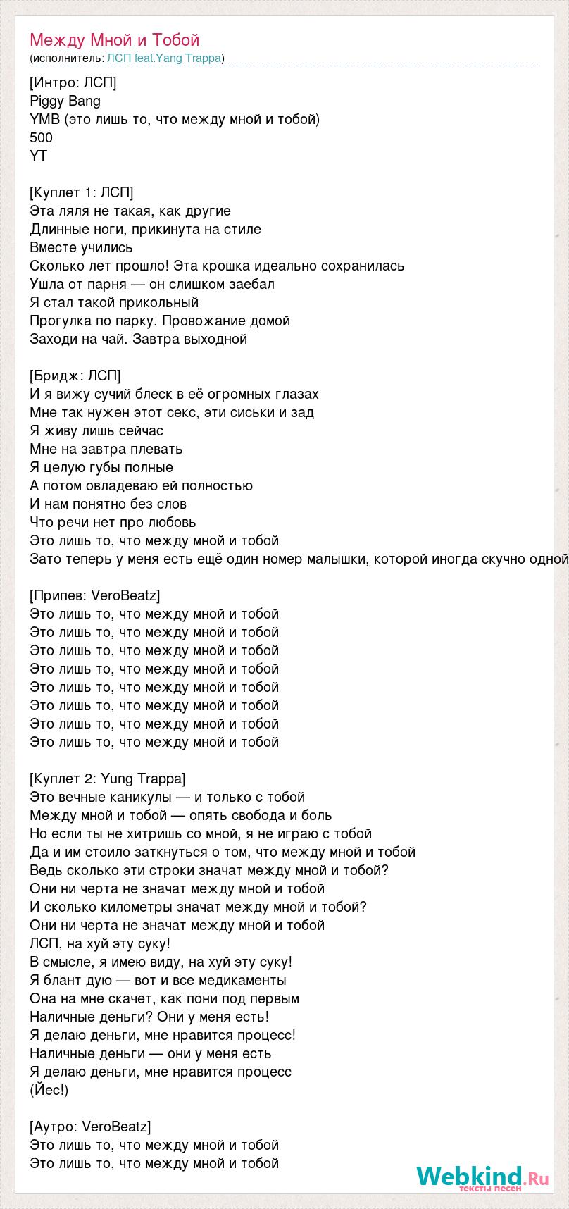 [Интро: ЛСП] Piggy Bang YMB (это лишь то, что между мной и тобой) 500 YT [Куплет 1: ЛСП] Эта ляля не такая, как другие Длинные ноги, прикинута на стиле Вместе учились Сколько лет прошло! Эта крошка идеально сохранилась Ушла от парня — он слишком заебал Я стал такой прикольный Прогулка по парку. Провожание домой Заходи на чай. Завтра выходной [Бридж: ЛСП] И я вижу сучий блеск в её огромных глазах Мне так нужен этот секс, эти сиськи и зад Я живу лишь сейчас Мне на завтра плевать Я целую губы полные А потом овладеваю ей полностью И нам понятно без слов Что речи нет про любовь Это лишь то, что между мной и тобой Зато теперь у меня есть ещё один номер малышки, которой иногда скучно одной [Припев: VeroBeatz] Это лишь то, что между мной и тобой Это лишь то, что между мной и тобой Это лишь то, что между мной и тобой Это лишь то, что между мной и тобой Это лишь то, что между мной и тобой Это лишь то, что между мной и тобой Это лишь то, что между мной и тобой Это лишь то, что между мной и тобой [Куплет 2: Yung Trappa] Это вечные каникулы — и только с тобой Между мной и тобой — опять свобода и боль Но если ты не хитришь со мной, я не играю с тобой Да и им стоило заткнуться о том, что между мной и тобой Ведь сколько эти строки значат между мной и тобой? Они ни черта не значат между мной и тобой И сколько километры значат между мной и тобой? Они ни черта не значат между мной и тобой ЛСП, на хуй эту суку! В смысле, я имею виду, на хуй эту суку! Я блант дую — вот и все медикаменты Она на мне скачет, как пони под первым Наличные деньги? Они у меня есть! Я делаю деньги, мне нравится процесс! Наличные деньги — они у меня есть Я делаю деньги, мне нравится процесс (Йес!) [Аутро: VeroBeatz] Это лишь то, что между мной и тобой Это лишь то, что между мной и тобой
