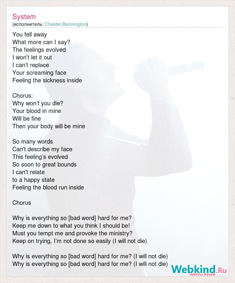 You fell away What more can I say? The feelings evolved I won’t let it out I can’t replace Your screaming face Feeling the sickness inside Chorus: Why won’t you die? Your blood in mine Will be fine Then your body will be mine So many words Can’t describe my face This feeling’s evolved So soon to great bounds I can’t relate to a happy state Feeling the blood run inside Chorus Why is everything so [bad word] hard for me? Keep me down to what you think I should be! Must you tempt me and provoke the ministry? Keep on trying, I’m not done so easily (I will not die) Why is everything so [bad word] hard for me? (I will not die) Why is everything so [bad word] hard for me? (I will not die)