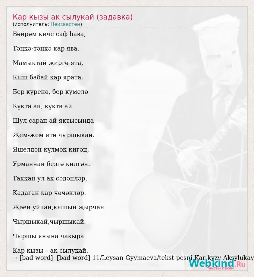 Бәйрәм киче саф һава, Тәңкә-тәңкә кар ява. Мамыктай җиргә ята, Кыш бабай кар ярата. Бер күренә, бер күмелә Күктә ай, күктә ай. Шул саран ай яктысында Җем-җем итә чыршыкай. Яшелдән күлмәк кигән, Урманнан безгә килгән. Таккан ул ак сәдәпләр, Кадаган кар чәчәкләр. Җәен уйчан,кышын җырчан Чыршыкай,чыршыкай. Чыршы янына чакыра Кар кызы – ак сылукай. → [bad word] [bad word] 11/Leysan-Gyymaeva/tekst-pesni-Kar-kyzy-Aksylukay