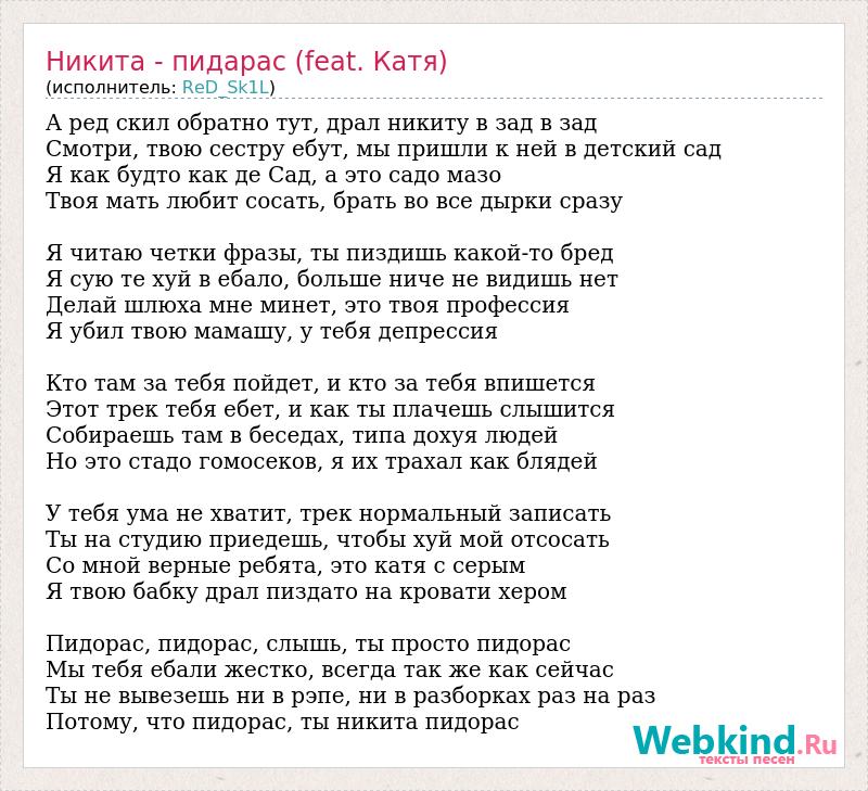 А ред скил обратно тут, драл никиту в зад в зад Смотри, твою сестру ебут, мы пришли к ней в детский сад Я как будто как де Сад, а это садо мазо Твоя мать любит сосать, брать во все дырки сразу Я читаю четки фразы, ты пиздишь какой-то бред Я сую те хуй в ебало, больше ниче не видишь нет Делай шлюха мне минет, это твоя профессия Я убил твою мамашу, у тебя депрессия Кто там за тебя пойдет, и кто за тебя впишется Этот трек тебя ебет, и как ты плачешь слышится Собираешь там в беседах, типа дохуя людей Но это стадо гомосеков, я их трахал как блядей У тебя ума не хватит, трек нормальный записать Ты на студию приедешь, чтобы хуй мой отсосать Со мной верные ребята, это катя с серым Я твою бабку драл пиздато на кровати хером Пидорас, пидорас, слышь, ты просто пидорас Мы тебя ебали жестко, всегда так же как сейчас Ты не вывезешь ни в рэпе, ни в разборках раз на раз Потому, что пидорас, ты никита пидорас