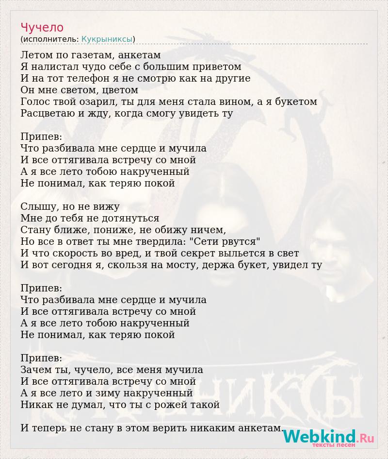 Летом по газетам, анкетам Я налистал чудо себе с большим приветом И на тот телефон я не смотрю как на другие Он мне светом, цветом Голос твой озарил, ты для меня стала вином, а я букетом Расцветаю и жду, когда смогу увидеть ту Припев: Что разбивала мне сердце и мучила И все оттягивала встречу со мной А я все лето тобою накрученный Не понимал, как теряю покой Слышу, но не вижу Мне до тебя не дотянуться Стану ближе, пониже, не обижу ничем, Но все в ответ ты мне твердила: "Сети рвутся" И что скорость во вред, и твой секрет выльется в свет И вот сегодня я, скользя на мосту, держа букет, увидел ту Припев: Что разбивала мне сердце и мучила И все оттягивала встречу со мной А я все лето тобою накрученный Не понимал, как теряю покой Припев: Зачем ты, чучело, все меня мучила И все оттягивала встречу со мной А я все лето и зиму накрученный Никак не думал, что ты с рожей такой И теперь не стану в этом верить никаким анкетам..