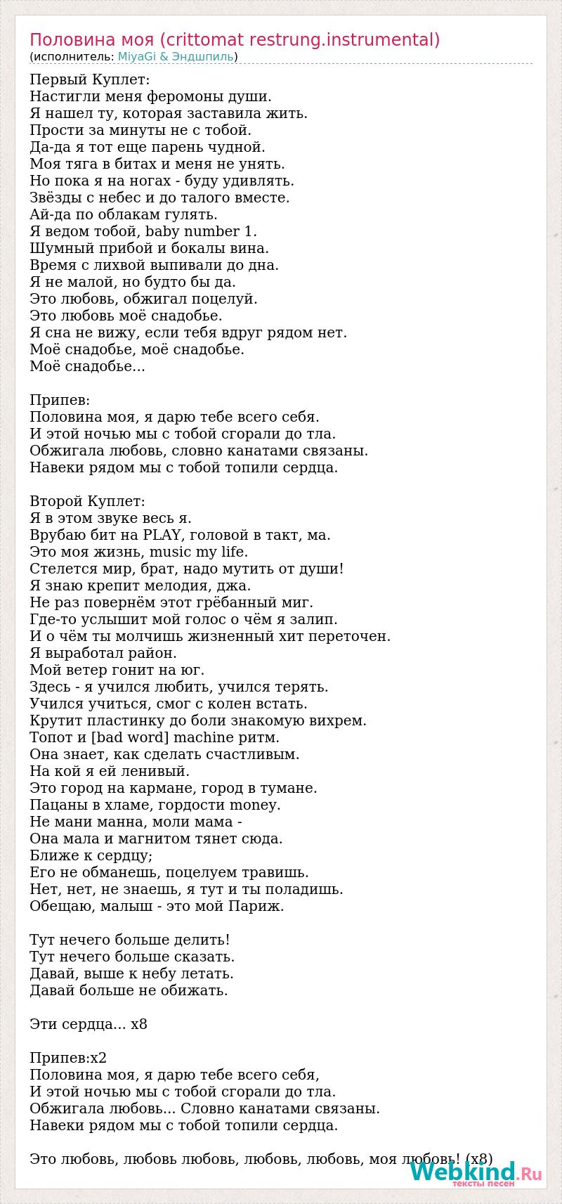 Первый Куплет: Настигли меня феромоны души. Я нашел ту, которая заставила жить. Прости за минуты не с тобой. Да-да я тот еще парень чудной. Моя тяга в битах и меня не унять. Но пока я на ногах - буду удивлять. Звёзды с небес и до талого вместе. Ай-да по облакам гулять. Я ведом тобой, baby number 1. Шумный прибой и бокалы вина. Время с лихвой выпивали до дна. Я не малой, но будто бы да. Это любовь, обжигал поцелуй. Это любовь моё снадобье. Я сна не вижу, если тебя вдруг рядом нет. Моё снадобье, моё снадобье. Моё снадобье... Припев: Половина моя, я дарю тебе всего себя. И этой ночью мы с тобой сгорали до тла. Обжигала любовь, словно канатами связаны. Навеки рядом мы с тобой топили сердца. Второй Куплет: Я в этом звуке весь я. Врубаю бит на PLAY, головой в такт, ма. Это моя жизнь, music my life. Стелется мир, брат, надо мутить от души! Я знаю крепит мелодия, джа. Не раз повернём этот грёбанный миг. Где-то услышит мой голос о чём я залип. И о чём ты молчишь жизненный хит переточен. Я выработал район. Мой ветер гонит на юг. Здесь - я учился любить, учился терять. Учился учиться, смог с колен встать. Крутит пластинку до боли знакомую вихрем. Топот и [bad word] machine ритм. Она знает, как сделать счастливым. На кой я ей ленивый. Это город на кармане, город в тумане. Пацаны в хламе, гордости money. Не мани манна, моли мама - Она мала и магнитом тянет сюда. Ближе к сердцу; Его не обманешь, поцелуем травишь. Нет, нет, не знаешь, я тут и ты поладишь. Обещаю, малыш - это мой Париж. Тут нечего больше делить! Тут нечего больше сказать. Давай, выше к небу летать. Давай больше не обижать. Эти сердца... x8 Припев:x2 Половина моя, я дарю тебе всего себя, И этой ночью мы с тобой сгорали до тла. Обжигала любовь... Словно канатами связаны. Навеки рядом мы с тобой топили сердца. Это любовь, любовь любовь, любовь, любовь, моя любовь! (х8)