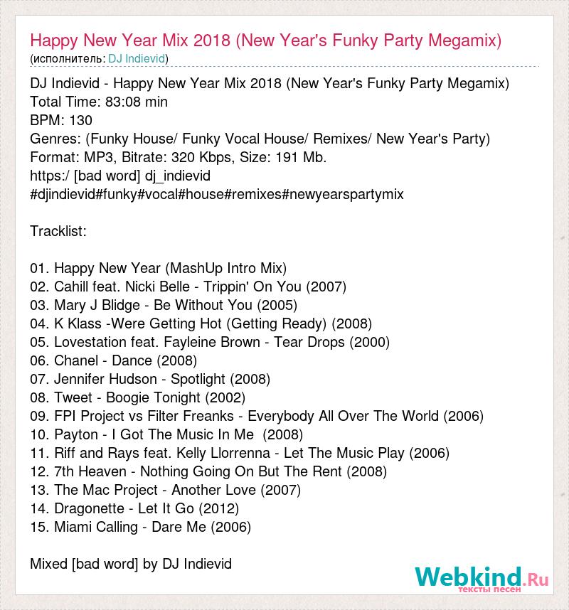 DJ Indievid - Happy New Year Mix 2018 (New Year's Funky Party Megamix) Total Time: 83:08 min BPM: 130 Genres: (Funky House/ Funky Vocal House/ Remixes/ New Year's Party) Format: MP3, Bitrate: 320 Kbps, Size: 191 Mb. https:/ [bad word] dj_indievid #djindievid#funky#vocal#house#remixes#newyearspartymix Tracklist: 01. Happy New Year (MashUp Intro Mix) 02. Cahill feat. Nicki Belle - Trippin' On You (2007) 03. Mary J Blidge - Be Without You (2005) 04. K Klass -Were Getting Hot (Getting Ready) (2008) 05. Lovestation feat. Fayleine Brown - Tear Drops (2000) 06. Chanel - Dance (2008) 07. Jennifer Hudson - Spotlight (2008) 08. Tweet - Boogie Tonight (2002) 09. FPI Project vs Filter Freanks - Everybody All Over The World (2006) 10. Payton - I Got The Music In Me (2008) 11. Riff and Rays feat. Kelly Llorrenna - Let The Music Play (2006) 12. 7th Heaven - Nothing Going On But The Rent (2008) 13. The Mac Project - Another Love (2007) 14. Dragonette - Let It Go (2012) 15. Miami Calling - Dare Me (2006) Mixed [bad word] by DJ Indievid
