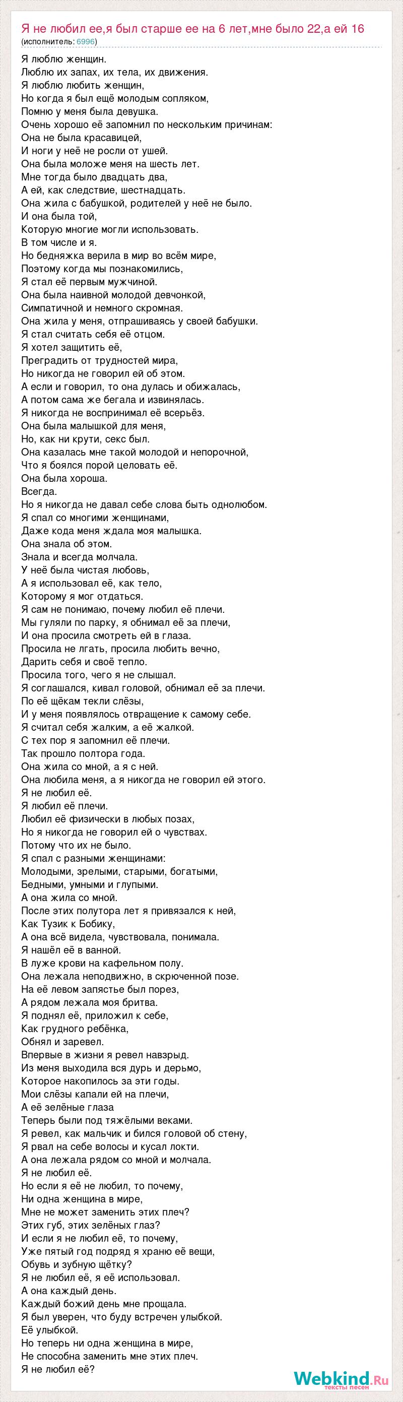 А как ты думаешь, о чем песня "Я не любил ее,я был старше ее на 6 лет,мне было 22,а ей 16" ?