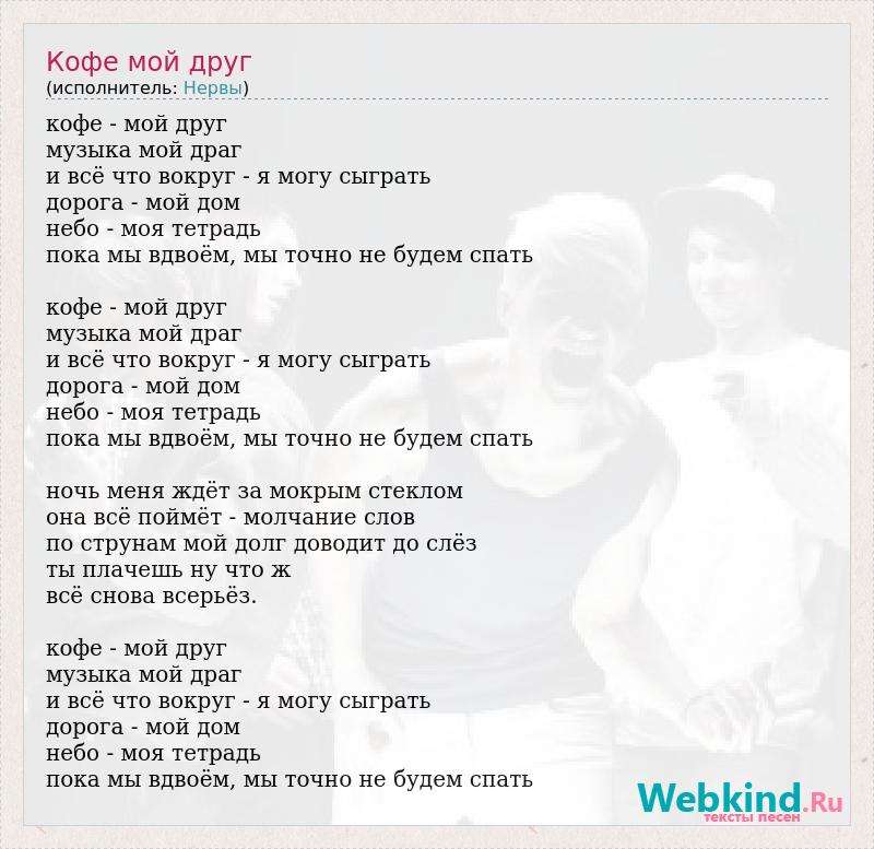кофе - мой друг музыка мой драг и всё что вокруг - я могу сыграть дорога - мой дом небо - моя тетрадь пока мы вдвоём, мы точно не будем спать кофе - мой друг музыка мой драг и всё что вокруг - я могу сыграть дорога - мой дом небо - моя тетрадь пока мы вдвоём, мы точно не будем спать ночь меня ждёт за мокрым стеклом она всё поймёт - молчание слов по струнам мой долг доводит до слёз ты плачешь ну что ж всё снова всерьёз. кофе - мой друг музыка мой драг и всё что вокруг - я могу сыграть дорога - мой дом небо - моя тетрадь пока мы вдвоём, мы точно не будем спать