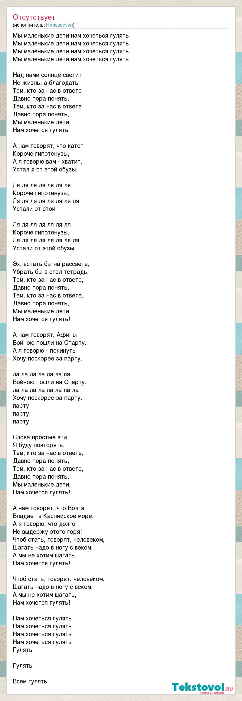 Мы маленькие дети нам хочеться гулять Мы маленькие дети нам хочеться гулять Мы маленькие дети нам хочеться гулять Мы маленькие дети нам хочеться гулять Над нами солнце светит Не жизнь, а благодать Тем, кто за нас в ответе Давно пора понять, Тем, кто за нас в ответе Давно пора понять, Мы маленькие дети, Нам хочется гулять А нам говорят, что катет Короче гипотенузы, А я говорю вам - хватит, Устал я от этой обузы. Ля ля ля ля ля ля ля Короче гипотенузы, Ля ля ля ля ля ля ля ля Устали от этой Ля ля ля ля ля ля ля Короче гипотенузы, Ля ля ля ля ля ля ля ля Устали от этой обузы. Эх, встать бы на расcвете, Убрать бы в стол тетрадь, Тем, кто за нас в ответе, Давно пора понять, Тем, кто за нас в ответе, Давно пора понять, Мы маленькие дети, Нам хочется гулять! А нам говорят, Афины Войною пошли на Спарту. А я говорю - покинуть Хочу поскорее за парту. ла ла ла ла ла ла ла Войною пошли на Спарту. ла ла ла ла ла ла ла ла Хочу поскорее за парту. парту парту парту Слова простые эти Я буду повторять, Тем, кто за нас в ответе, Давно пора понять, Тем, кто за нас в ответе, Давно пора понять, Мы маленькие дети, Нам хочется гулять! А нам говорят, что Волга Впадает в Каспийское море, А я говорю, что долго Не выдержу этого горя! Чтоб стать, говорят, человеком, Шагать надо в ногу с веком, А мы не хотим шагать, Нам хочется гулять! Чтоб стать, говорят, человеком, Шагать надо в ногу с веком, А мы не хотим шагать, Нам хочется гулять! Нам хочеться гулять Нам хочеться гулять Нам хочеться гулять Нам хочеться гулять Гулять Гулять Всем гулять