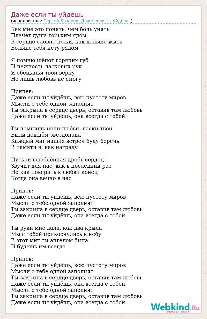 Как мне это понять, чем боль унять Плачет душа горьким ядом В сердце словно ножи, как дальше жить Больше тебя нету рядом Я помню шёпот горячих губ И нежность ласковых рук Я обещанья твои верну Но лишь любовь не смогу Припев: Даже если ты уйдёшь, всю пустоту миров Мысли о тебе одной заполнят Ты закрыла в сердце дверь, оставив там любовь Даже если ты уйдёшь, она всегда с тобой Ты помнишь ночи любви, ласки твои Были дождём звездопада Каждый миг наших встреч буду беречь В памяти я, как награду Пускай влюблённая дробь сердец Звучит для нас, как в последний раз Но как поверить в любви конец Когда она вечно в нас Припев: Даже если ты уйдёшь, всю пустоту миров Мысли о тебе одной заполнят Ты закрыла в сердце дверь, оставив там любовь Даже если ты уйдёшь, она всегда с тобой Ты руки мне дала, как два крыла Мы с тобой прикоснулись к небу В этот миг ты ангелом была И будешь им всегда Припев: Даже если ты уйдёшь, всю пустоту миров Мысли о тебе одной заполнят Ты закрыла в сердце дверь, оставив там любовь Даже если ты уйдёшь, она всегда с тобой Мысли о тебе одной заполнят Ты закрыла в сердце дверь, оставив там любовь Даже если ты уйдёшь, она всегда с тобой