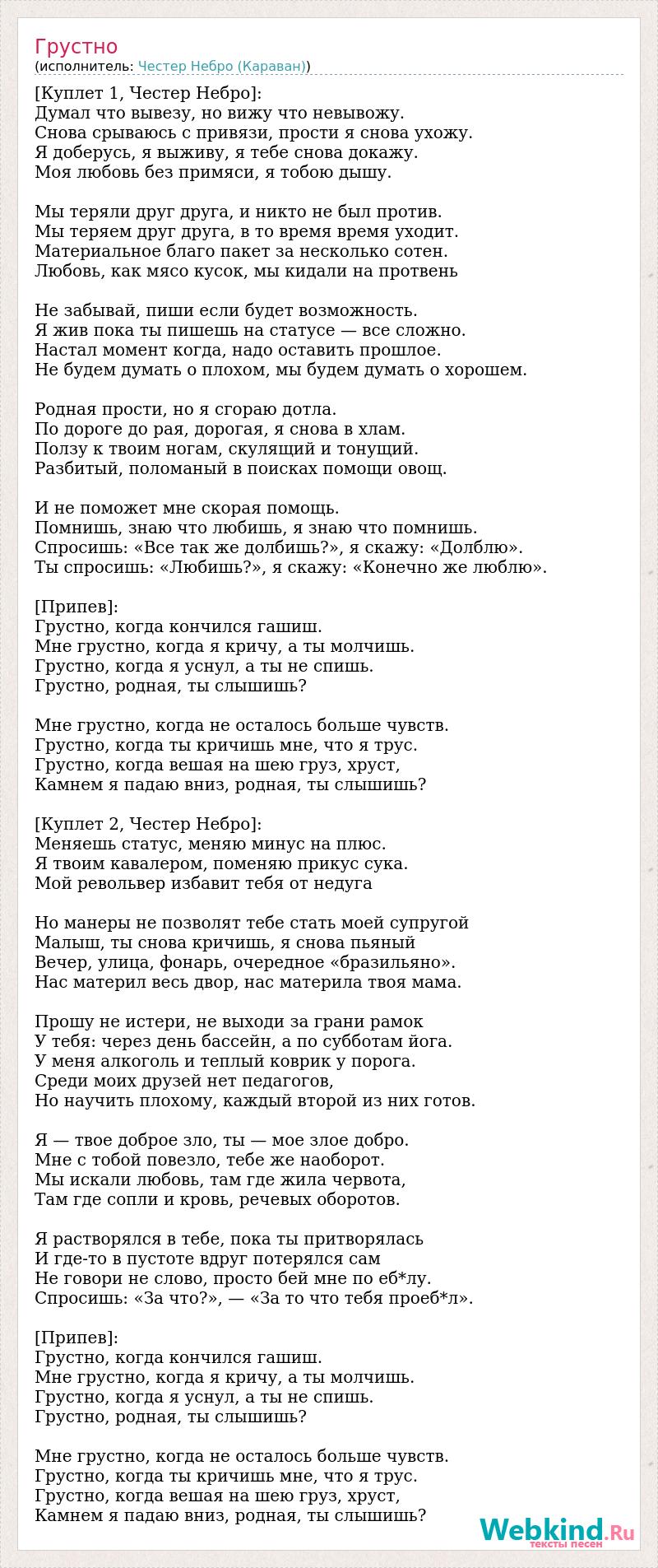 [Куплет 1, Честер Небро]: Думал что вывезу, но вижу что невывожу. Снова срываюсь с привязи, прости я снова ухожу. Я доберусь, я выживу, я тебе снова докажу. Моя любовь без примяси, я тобою дышу. Мы теряли друг друга, и никто не был против. Мы теряем друг друга, в то время время уходит. Материальное благо пакет за несколько сотен. Любовь, как мясо кусок, мы кидали на протвень Не забывай, пиши если будет возможность. Я жив пока ты пишешь на статусе — все сложно. Настал момент когда, надо оставить прошлое. Не будем думать о плохом, мы будем думать о хорошем. Родная прости, но я сгораю дотла. По дороге до рая, дорогая, я снова в хлам. Ползу к твоим ногам, скулящий и тонущий. Разбитый, поломаный в поисках помощи овощ. И не поможет мне скорая помощь. Помнишь, знаю что любишь, я знаю что помнишь. Спросишь: «Все так же долбишь?», я скажу: «Долблю». Ты спросишь: «Любишь?», я скажу: «Конечно же люблю». [Припев]: Грустно, когда кончился гашиш. Мне грустно, когда я кричу, а ты молчишь. Грустно, когда я уснул, а ты не спишь. Грустно, родная, ты слышишь? Мне грустно, когда не осталось больше чувств. Грустно, когда ты кричишь мне, что я трус. Грустно, когда вешая на шею груз, хруст, Камнем я падаю вниз, родная, ты слышишь? [Куплет 2, Честер Небро]: Меняешь статус, меняю минус на плюс. Я твоим кавалером, поменяю прикус сука. Мой револьвер избавит тебя от недуга Но манеры не позволят тебе стать моей супругой Малыш, ты снова кричишь, я снова пьяный Вечер, улица, фонарь, очередное «бразильяно». Нас материл весь двор, нас материла твоя мама. Прошу не истери, не выходи за грани рамок У тебя: через день бассейн, а по субботам йога. У меня алкоголь и теплый коврик у порога. Среди моих друзей нет педагогов, Но научить плохому, каждый второй из них готов. Я — твое доброе зло, ты — мое злое добро. Мне с тобой повезло, тебе же наоборот. Мы искали любовь, там где жила червота, Там где сопли и кровь, речевых оборотов. Я растворялся в тебе, пока ты притворялась И где-то в пустоте вдруг потерялся сам Не говори не слово, просто бей мне по еб*лу. Спросишь: «За что?», — «За то что тебя проеб*л». [Припев]: Грустно, когда кончился гашиш. Мне грустно, когда я кричу, а ты молчишь. Грустно, когда я уснул, а ты не спишь. Грустно, родная, ты слышишь? Мне грустно, когда не осталось больше чувств. Грустно, когда ты кричишь мне, что я трус. Грустно, когда вешая на шею груз, хруст, Камнем я падаю вниз, родная, ты слышишь?