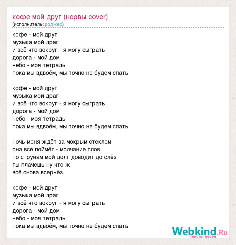 кофе - мой друг музыка мой драг и всё что вокруг - я могу сыграть дорога - мой дом небо - моя тетрадь пока мы вдвоём, мы точно не будем спать кофе - мой друг музыка мой драг и всё что вокруг - я могу сыграть дорога - мой дом небо - моя тетрадь пока мы вдвоём, мы точно не будем спать ночь меня ждёт за мокрым стеклом она всё поймёт - молчание слов по струнам мой долг доводит до слёз ты плачешь ну что ж всё снова всерьёз. кофе - мой друг музыка мой драг и всё что вокруг - я могу сыграть дорога - мой дом небо - моя тетрадь пока мы вдвоём, мы точно не будем спать
