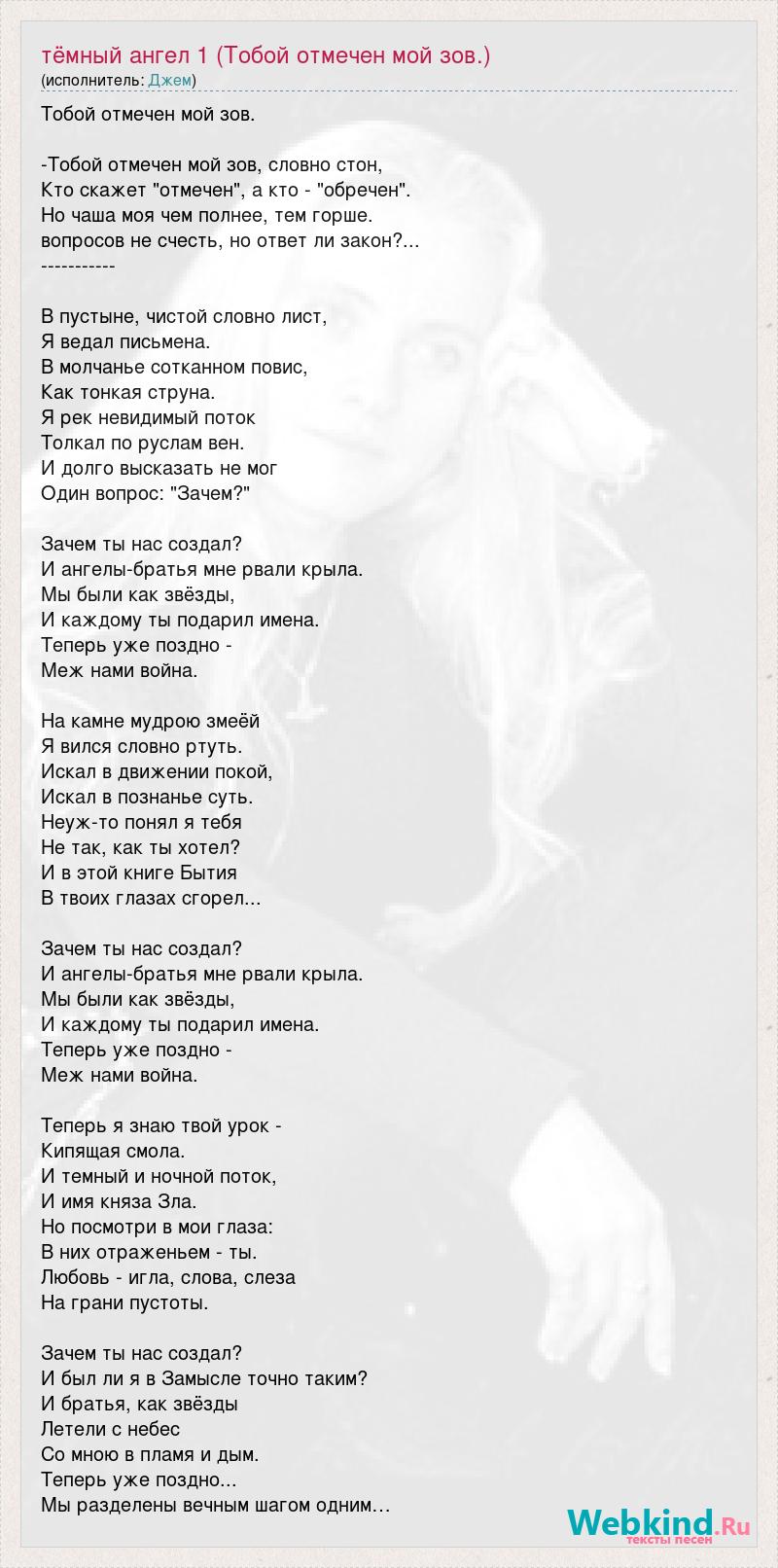 А как ты думаешь, о чем песня "Тёмный ангел 1 (Тобой отмечен мой зов.)" ?