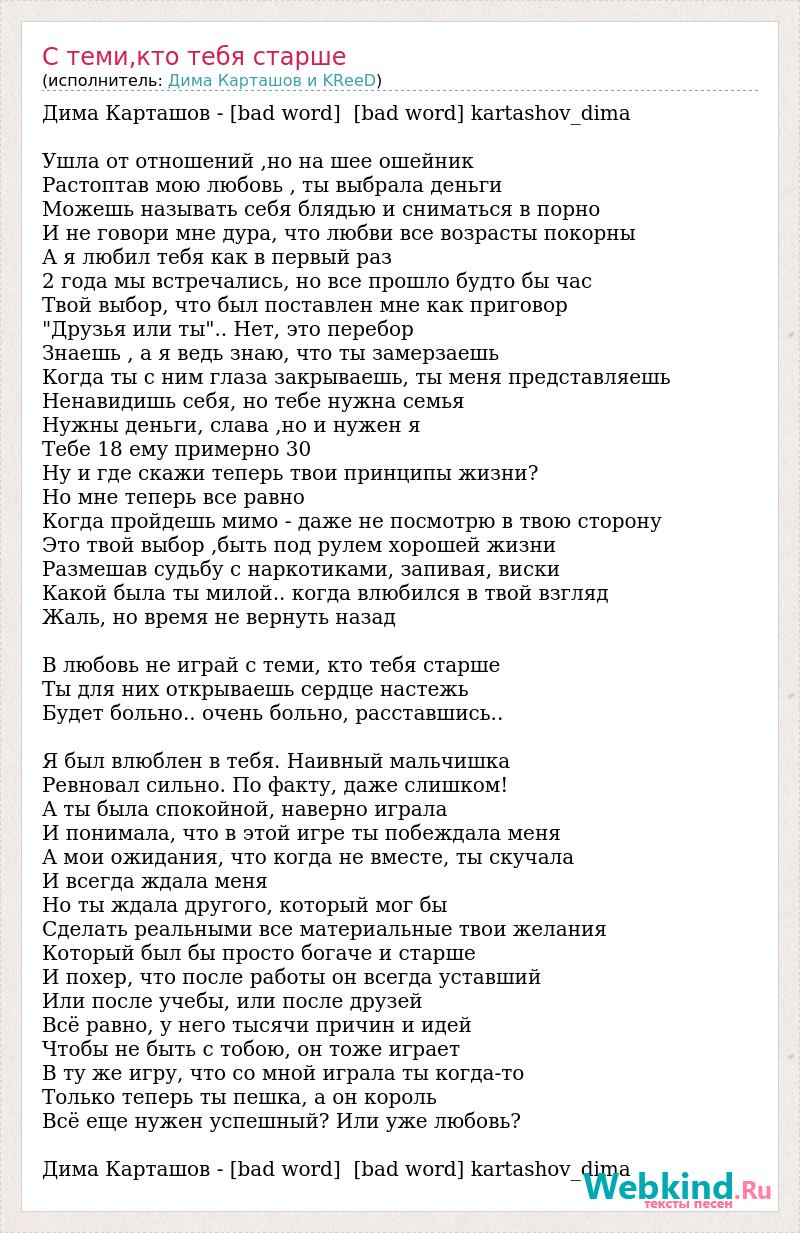 Дима Карташов - [bad word] [bad word] kartashov_dima Ушла от отношений ,но на шее ошейник Растоптав мою любовь , ты выбрала деньги Можешь называть себя блядью и сниматься в порно И не говори мне дура, что любви все возрасты покорны А я любил тебя как в первый раз 2 года мы встречались, но все прошло будто бы час Твой выбор, что был поставлен мне как приговор "Друзья или ты".. Нет, это перебор Знаешь , а я ведь знаю, что ты замерзаешь Когда ты с ним глаза закрываешь, ты меня представляешь Ненавидишь себя, но тебе нужна семья Нужны деньги, слава ,но и нужен я Тебе 18 ему примерно 30 Ну и где скажи теперь твои принципы жизни? Но мне теперь все равно Когда пройдешь мимо - даже не посмотрю в твою сторону Это твой выбор ,быть под рулем хорошей жизни Размешав судьбу с наркотиками, запивая, виски Какой была ты милой.. когда влюбился в твой взгляд Жаль, но время не вернуть назад В любовь не играй с теми, кто тебя старше Ты для них открываешь сердце настежь Будет больно.. очень больно, расставшись.. Я был влюблен в тебя. Наивный мальчишка Ревновал сильно. По факту, даже слишком! А ты была спокойной, наверно играла И понимала, что в этой игре ты побеждала меня А мои ожидания, что когда не вместе, ты скучала И всегда ждала меня Но ты ждала другого, который мог бы Сделать реальными все материальные твои желания Который был бы просто богаче и старше И похер, что после работы он всегда уставший Или после учебы, или после друзей Всё равно, у него тысячи причин и идей Чтобы не быть с тобою, он тоже играет В ту же игру, что со мной играла ты когда-то Только теперь ты пешка, а он король Всё еще нужен успешный? Или уже любовь? Дима Карташов - [bad word] [bad word] kartashov_dima