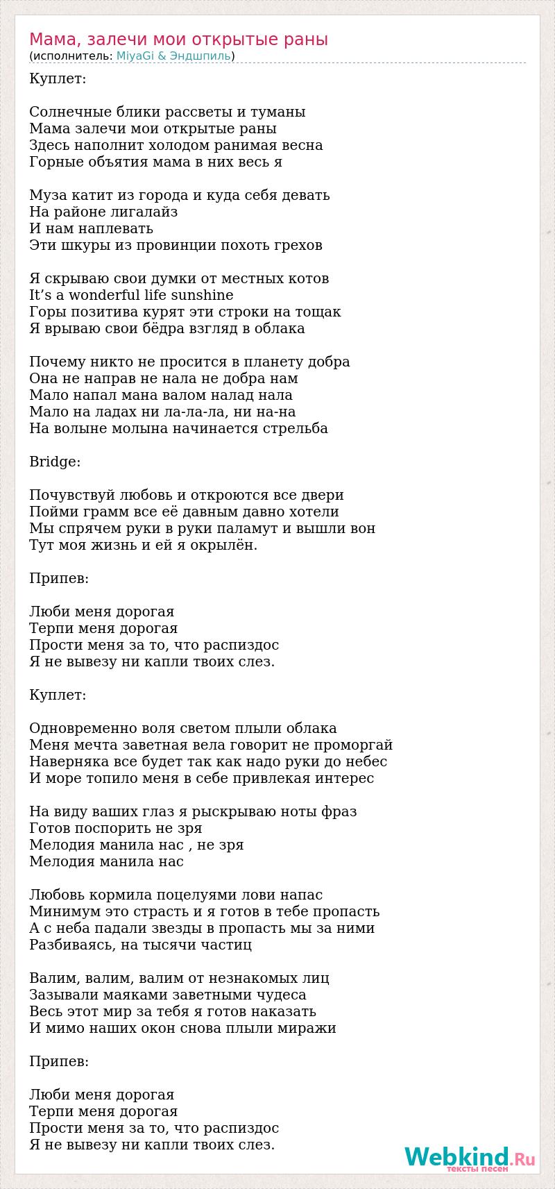 Куплет: Солнечные блики рассветы и туманы Мама залечи мои открытые раны Здесь наполнит холодом ранимая весна Горные объятия мама в них весь я Муза катит из города и куда себя девать На районе лигалайз И нам наплевать Эти шкуры из провинции похоть грехов Я скрываю свои думки от местных котов It’s a wonderful life sunshine Горы позитива курят эти строки на тощак Я врываю свои бёдра взгляд в облака Почему никто не просится в планету добра Она не направ не нала не добра нам Мало напал мана валом налад нала Мало на ладах ни ла-ла-ла, ни на-на На волыне молына начинается стрельба Bridge: Почувствуй любовь и откроются все двери Пойми грамм все её давным давно хотели Мы спрячем руки в руки паламут и вышли вон Тут моя жизнь и ей я окрылён. Припев: Люби меня дорогая Терпи меня дорогая Прости меня за то, что распиздос Я не вывезу ни капли твоих слез. Куплет: Одновременно воля светом плыли облака Меня мечта заветная вела говорит не проморгай Наверняка все будет так как надо руки до небес И море топило меня в себе привлекая интерес На виду ваших глаз я рыскрываю ноты фраз Готов поспорить не зря Мелодия манила нас , не зря Мелодия манила нас Любовь кормила поцелуями лови напас Минимум это страсть и я готов в тебе пропасть А с неба падали звезды в пропасть мы за ними Разбиваясь, на тысячи частиц Валим, валим, валим от незнакомых лиц Зазывали маяками заветными чудеса Весь этот мир за тебя я готов наказать И мимо наших окон снова плыли миражи Припев: Люби меня дорогая Терпи меня дорогая Прости меня за то, что распиздос Я не вывезу ни капли твоих слез.