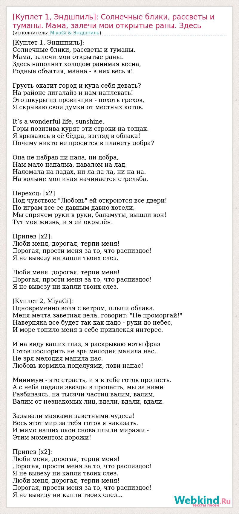 [Куплет 1, Эндшпиль]: Солнечные блики, рассветы и туманы. Мама, залечи мои открытые раны. Здесь наполнит холодом ранимая весна, Родные объятия, манна - в них весь я! Грусть окатит город и куда себя девать? На районе лигалайз и нам наплевать! Это шкуры из провинции - похоть грехов, Я скрываю свои думки от местных котов. It’s a wonderful life, sunshine. Горы позитива курят эти строки на тощак. Я врываюсь в её бёдра, взгляд в облака! Почему никто не просится в планету добра? Она не набрав ни нала, ни добра, Нам мало напалма, навалом на лад. Наломала на ладах, ни ла-ла-ла, ни на-на. На волыне мол иная начинается стрельба. Переход: [х2] Под чувством "Любовь" ей откроются все двери! По играм все ее давным давно хотели. Мы спрячем руки в руки, баламуты, вышли вон! Тут моя жизнь, и я ей окрылён. Припев [х2]: Люби меня, дорогая, терпи меня! Дорогая, прости меня за то, что распиздос! Я не вывезу ни капли твоих слез. Люби меня, дорогая, терпи меня! Дорогая, прости меня за то, что распиздос! Я не вывезу ни капли твоих слез. [Куплет 2, MiyaGi]: Одновременно воля с ветром, плыли облака. Меня мечта заветная вела, говорит: "Не проморгай!" Наверняка все будет так как надо - руки до небес, И море топило меня в себе привлекая интерес. И на виду ваших глаз, я раскрываю ноты фраз Готов поспорить не зря мелодия манила нас. Не зря мелодия манила нас. Любовь кормила поцелуями, лови напас! Минимум - это страсть, и я в тебе готов пропасть. А с неба падали звезды в пропасть, мы за ними Разбиваясь, на тысячи частиц валим, валим, Валим от незнакомых лиц, вдали, вдали, вдали. Зазывали маяками заветными чудеса! Весь этот мир за тебя готов я наказать. И мимо наших окон снова плыли миражи - Этим моментом дорожи! Припев [х2]: Люби меня, дорогая, терпи меня! Дорогая, прости меня за то, что распиздос! Я не вывезу ни капли твоих слез. Люби меня, дорогая, терпи меня! Дорогая, прости меня за то, что распиздос! Я не вывизу ни капли твоих слез...