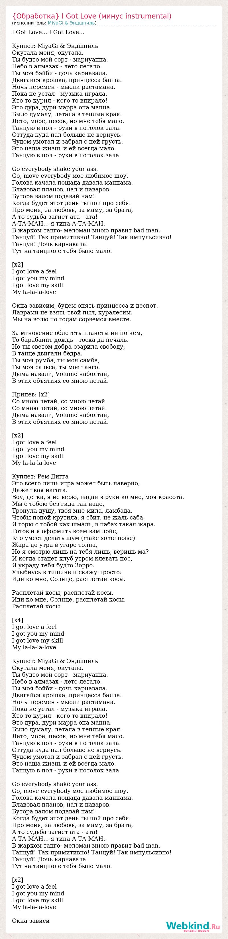 I Got Love... I Got Love... Куплет: MiyaGi & Эндшпиль Окутала меня, окутала. Ты будто мой сорт - мариуанна. Небо в алмазах - лето летало. Ты моя бэйби - дочь карнавала. Двигайся крошка, принцесса балла. Ночь перемен - мысли растамана. Пока не устал - музыка играла. Кто то курил - кого то впирало! Это дура, дури марра она манна. Было думалу, летала в теплые края. Лето, море, песок, но мне тебя мало. Танцую в пол - руки в потолок зала. Оттуда куда пал больше не вернусь. Чудом умотал и забрал с ней грусть. Это наша жизнь и ей всегда мало. Танцую в пол - руки в потолок зала. Go everybody shake your ass. Go, move everybody мое любимое шоу. Голова качала пощада давала маннама. Блавовал планов, нал и наваров. Бутора валом подавай нам! Когда будет этот день ты пой про себя. Про меня, за любовь, за маму, за брата, А то судьба загнет ата - ата! А-ТА-МАН... я типа А-ТА-МАН.. В жарком танго- меломан мною правит bad man. Танцуй! Так примитивно! Танцуй! Так импульсивно! Танцуй! Дочь карнавала. Тут на танцполе тебя было мало. [x2] I got love a feel I got you my mind I got love my skill My la-la-la-love Окна зависим, будем опять принцесса и деспот. Лаврами не взять твой пыл, куралесим. Мы на волю по годам сорвемся вместе. За мгновение облететь планеты ни по чем, То барабанит дождь - тоска да печаль. Но ты светом добра озарила свободу, В танце двигали бёдра. Ты моя румба, ты моя самба, Ты моя сальса, ты мое танго. Дыма навали, Volume наболтай, В этих объятиях со мною летай. Припев: [х2] Со мною летай, со мною летай. Со мною летай, со мною летай. Дыма навали, Volume наболтай, В этих объятиях со мною летай. [х2] I got love a feel I got you my mind I got love my skill My la-la-la-love Куплет: Рем Дигга Это всего лишь игра может быть наверно, Даже твоя нагота. Воу, детка, я не верю, падай в руки ко мне, моя красота. Мы с тобою без гида так надо, Тронула душу, твоя мне мила, ламбада. Чтобы попой крутила, я сбит, не жаль саба, Я горю с тобой как шмаль, в пабах такая жара. Готов и я оформить всем вам лойс, Кто умеет делать шум (make some noise) Жара до утра в угаре толпа, Но я смотрю лишь на тебя лишь, веришь ма? И когда станет клуб утром клевать нос, Я украду тебя будто Зорро. Улыбнусь в тишине и скажу просто: Иди ко мне, Солнце, расплетай косы. Расплетай косы, расплетай косы. Иди ко мне, Солнце, расплетай косы. Расплетай косы. [x4] I got love a feel I got you my mind I got love my skill My la-la-la-love Куплет: MiyaGi & Эндшпиль Окутала меня, окутала. Ты будто мой сорт - мариуанна. Небо в алмазах - лето летало. Ты моя бэйби - дочь карнавала. Двигайся крошка, принцесса балла. Ночь перемен - мысли растамана. Пока не устал - музыка играла. Кто то курил - кого то впирало! Это дура, дури марра она манна. Было думалу, летала в теплые края. Лето, море, песок, но мне тебя мало. Танцую в пол - руки в потолок зала. Оттуда куда пал больше не вернусь. Чудом умотал и забрал с ней грусть. Это наша жизнь и ей всегда мало. Танцую в пол - руки в потолок зала. Go everybody shake your ass. Go, move everybody мое любимое шоу. Голова качала пощада давала маннама. Блавовал планов, нал и наваров. Бутора валом подавай нам! Когда будет этот день ты пой про себя. Про меня, за любовь, за маму, за брата, А то судьба загнет ата - ата! А-ТА-МАН... я типа А-ТА-МАН.. В жарком танго- меломан мною правит bad man. Танцуй! Так примитивно! Танцуй! Так импульсивно! Танцуй! Дочь карнавала. Тут на танцполе тебя было мало. [x2] I got love a feel I got you my mind I got love my skill My la-la-la-love Окна зависи