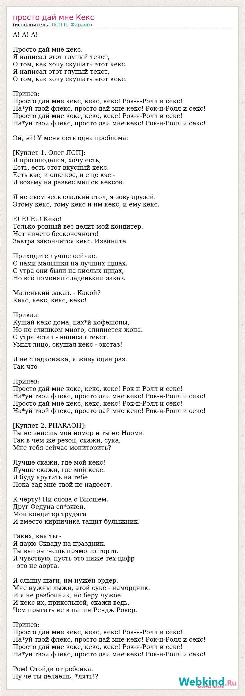 А! А! А! Просто дай мне кекс. Я написал этот глупый текст, О том, как хочу скушать этот кекс. Я написал этот глупый текст, О том, как хочу скушать этот кекс. Припев: Просто дай мне кекс, кекс, кекс! Рок-н-Ролл и секс! На*уй твой флекс, просто дай мне кекс! Рок-н-Ролл и секс! Просто дай мне кекс, кекс, кекс! Рок-н-Ролл и секс! На*уй твой флекс, просто дай мне кекс! Рок-н-Ролл и секс! Эй, эй! У меня есть одна проблема: [Куплет 1, Олег ЛСП]: Я проголодался, хочу есть, Есть, есть этот вкусный кекс. Есть кэс, и еще кэс, и еще кэс - Я возьму на развес мешок кексов. Я не съем весь сладкий стол, я зову друзей. Этому кекс, тому кекс и им кекс, и ему кекс. Е! Е! Ей! Кекс! Только ровный вес делит мой кондитер. Нет ничего бесконечного! Завтра закончится кекс. Извините. Приходите лучше сейчас. С нами малышки на лучших щщах. С утра они были на кислых щщах, Но всё поменял сладенький заказ. Маленький заказ. - Какой? Кекс, кекс, кекс, кекс! Приказ: Кушай кекс дома, нах*й кофешопы, Но не слишком много, слипнется жопа. С утра встал - написал текст. Умыл лицо, скушал кекс - экстаз! Я не сладкоежка, я живу один раз. Так что - Припев: Просто дай мне кекс, кекс, кекс! Рок-н-Ролл и секс! На*уй твой флекс, просто дай мне кекс! Рок-н-Ролл и секс! Просто дай мне кекс, кекс, кекс! Рок-н-Ролл и секс! На*уй твой флекс, просто дай мне кекс! Рок-н-Ролл и секс! [Куплет 2, PHARAOH]: Ты не знаешь мой номер и ты не Наоми. Так в чем же резон, скажи, сука, Мне тебя сейчас мониторить? Лучше скажи, где мой кекс! Лучше скажи, где мой кекс. Я буду крутить на тебе Пока зад мне твой не надоест. К черту! Ни слова о Высшем. Друг Федуна сп*зжен. Мой кондитер трудяга И вместо кирпичика тащит булыжник. Таких, как ты - Я дарю Скваду на праздник. Ты выпрыгнешь прямо из торта. Я чувствую, пусть это ниже тех цифр - это не аорта. Я слышу шаги, им нужен ордер. Мне нужны лыжи, этой суке - намордник. И я не разбойник, но беру чужое. И кекс их, прикольней, скажи ведь, Чем прыгать не в папин Рендж Ровер. Припев: Просто дай мне кекс, кекс, кекс! Рок-н-Ролл и секс! На*уй твой флекс, просто дай мне кекс! Рок-н-Ролл и секс! Просто дай мне кекс, кекс, кекс! Рок-н-Ролл и секс! На*уй твой флекс, просто дай мне кекс! Рок-н-Ролл и секс! Ром! Отойди от ребенка. Ну чё ты делаешь, *лять!?