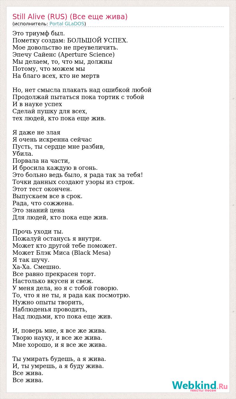 Это триумф был. Пометку создам: БОЛЬШОЙ УСПЕХ. Мое довольство не преувеличить. Эпечу Сайенс (Aperture Science) Мы делаем, то, что мы, должны Потому, что можем мы На благо всех, кто не мертв Но, нет смысла плакать над ошибкой любой Продолжай пытаться пока тортик с тобой И в науке успех Сделай пушку для всех, тех людей, кто пока еще жив. Я даже не злая Я очень искренна сейчас Пусть, ты сердце мне разбив, Убила. Порвала на части, И бросила каждую в огонь. Это больно ведь было, я рада так за тебя! Точки данных создают узоры из строк. Этот тест окончен. Выпускаем все в срок. Рада, что сожжена. Это знаний цена Для людей, кто пока еще жив. Прочь уходи ты. Пожалуй останусь я внутри. Может кто другой тебе поможет. Может Блэк Миса (Black Mesa) Я так шучу. Ха-Ха. Смешно. Все равно прекрасен торт. Настолько вкусен и свеж. У меня дела, но я с тобой говорю. То, что я не ты, я рада как посмотрю. Нужно опыты творить, Наблюденья проводить, Над людьми, кто пока еще жив. И, поверь мне, я все же жива. Творю науку, и все же жива. Мне хорошо, и я все же жива. Ты умирать будешь, а я жива. И, ты умрешь, а я буду жива. Все жива. Все жива.