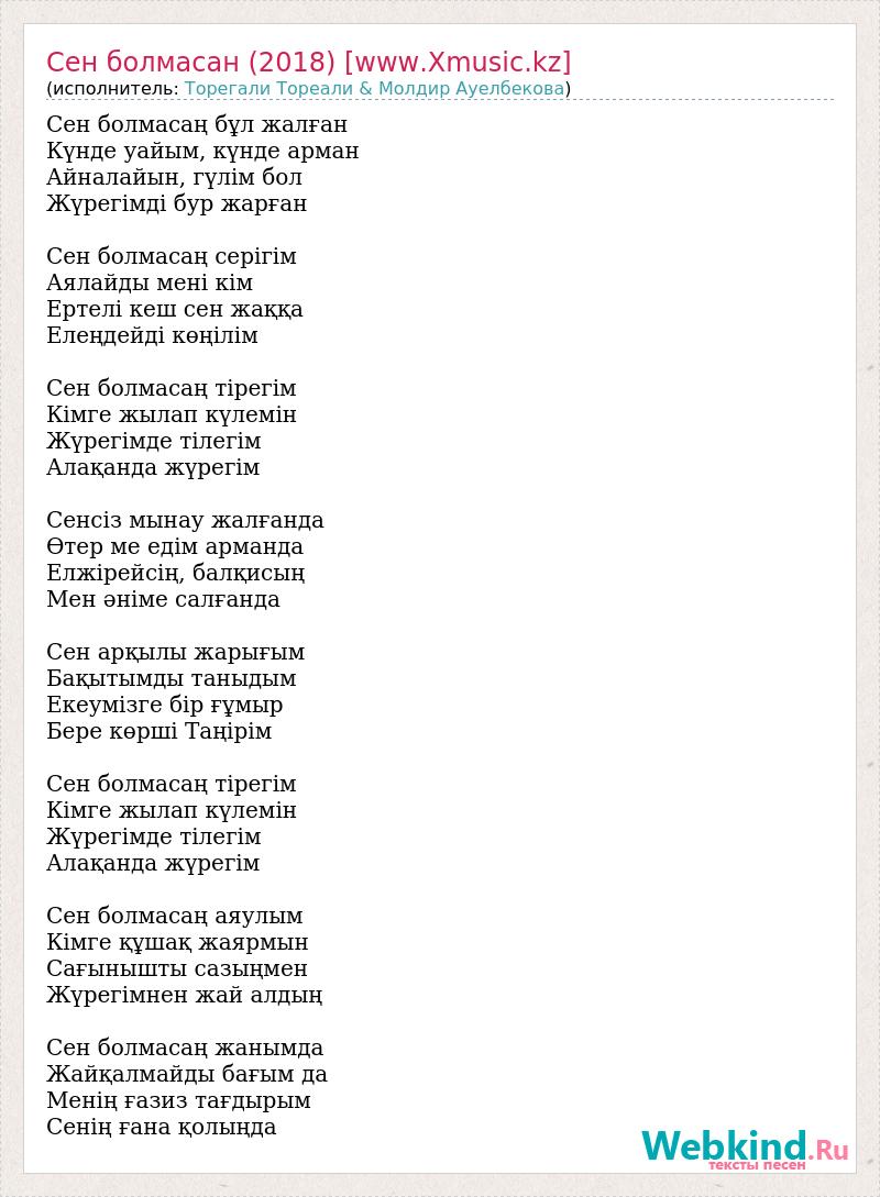 Сен болмасаң бұл жалған Күнде уайым, күнде арман Айналайын, гүлiм бол Жүрегiмдi бур жарған Сен болмасаң серiгiм Аялайды менi кiм Ертелi кеш сен жаққа Елеңдейдi көңiлiм Сен болмасаң тiрегiм Кiмге жылап күлемiн Жүрегiмде тiлегiм Алақанда жүрегiм Сенсiз мынау жалғанда Өтер ме едiм арманда Елжiрейсiң, балқисың Мен әнiме салғанда Сен арқылы жарығым Бақытымды таныдым Екеумiзге бiр ғұмыр Бере көршi Таңiрiм Сен болмасаң тiрегiм Кiмге жылап күлемiн Жүрегiмде тiлегiм Алақанда жүрегiм Сен болмасаң аяулым Кiмге құшақ жаярмын Сағынышты сазыңмен Жүрегiмнен жай алдың Сен болмасаң жанымда Жайқалмайды бағым да Менiң ғазиз тағдырым Сенiң ғана қолыңда