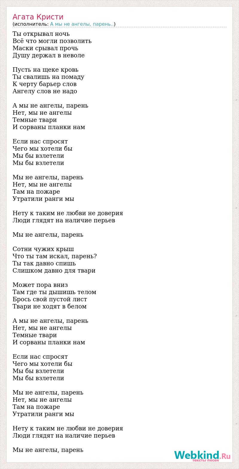 Ты открывал ночь Всё что могли позволить Маски срывал прочь Душу держал в неволе Пусть на щеке кровь Ты свалишь на помаду К черту барьер слов Ангелу слов не надо А мы не ангелы, парень Нет, мы не ангелы Темные твари И сорваны планки нам Если нас спросят Чего мы хотели бы Мы бы взлетели Мы бы взлетели Мы не ангелы, парень Нет, мы не ангелы Там на пожаре Утратили ранги мы Нету к таким не любви не доверия Люди глядят на наличие перьев Мы не ангелы, парень Сотни чужих крыш Что ты там искал, парень? Ты так давно спишь Слишком давно для твари Может пора вниз Там где ты дышишь телом Брось свой пустой лист Твари не ходят в белом А мы не ангелы, парень Нет, мы не ангелы Темные твари И сорваны планки нам Если нас спросят Чего мы хотели бы Мы бы взлетели Мы бы взлетели Мы не ангелы, парень Нет, мы не ангелы Там на пожаре Утратили ранги мы Нету к таким не любви не доверия Люди глядят на наличие перьев Мы не ангелы, парень