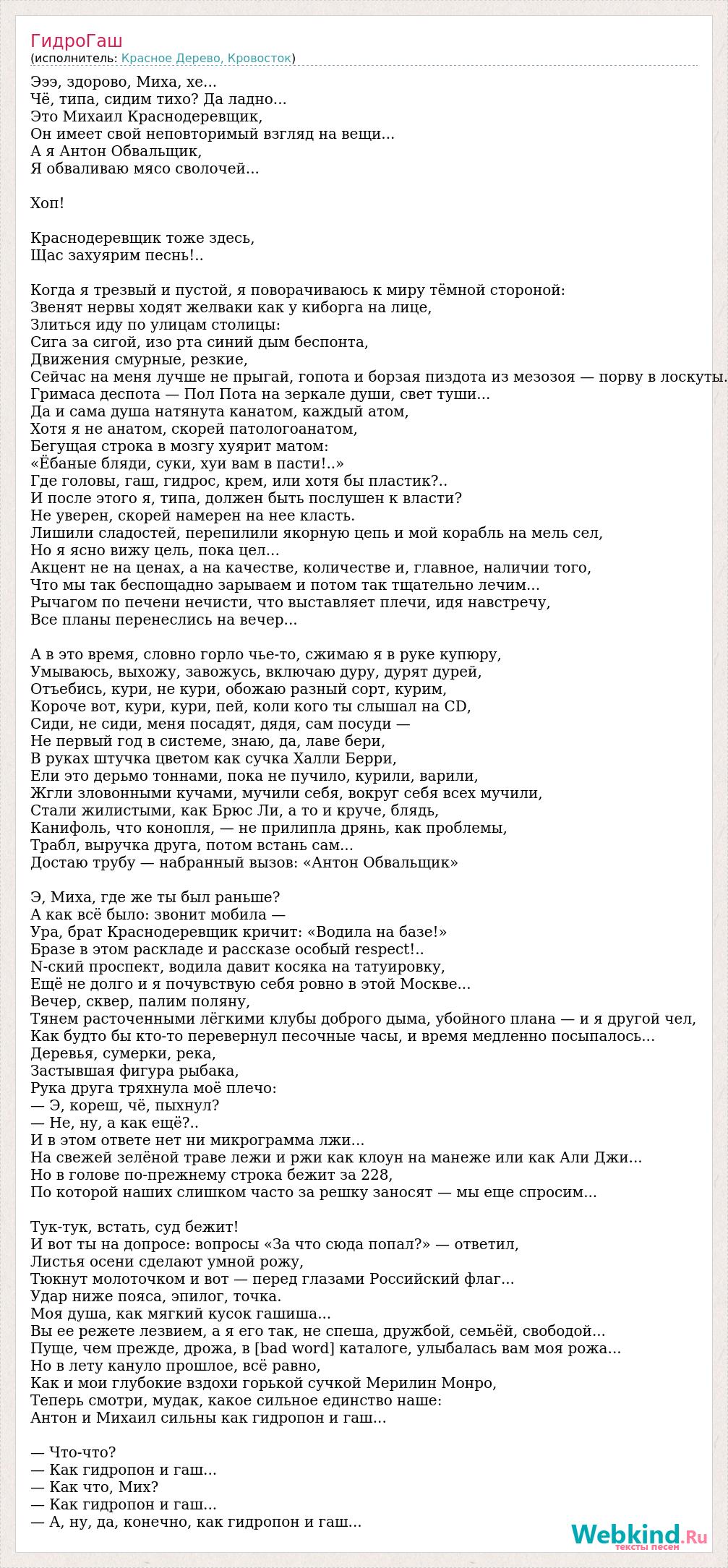 Эээ, здорово, Миха, хе... Чё, типа, сидим тихо? Да ладно... Это Михаил Краснодеревщик, Он имеет свой неповторимый взгляд на вещи... А я Антон Обвальщик, Я обваливаю мясо сволочей... Хоп! Краснодеревщик тоже здесь, Щас захуярим песнь!.. Когда я трезвый и пустой, я поворачиваюсь к миру тёмной стороной: Звенят нервы ходят желваки как у киборга на лице, Злиться иду по улицам столицы: Сига за сигой, изо рта синий дым беспонта, Движения смурные, резкие, Сейчас на меня лучше не прыгай, гопота и борзая пиздота из мезозоя — порву в лоскуты. Гримаса деспота — Пол Пота на зеркале души, свет туши... Да и сама душа натянута канатом, каждый атом, Хотя я не анатом, скорей патологоанатом, Бегущая строка в мозгу хуярит матом: «Ёбаные бляди, суки, хуи вам в пасти!..» Где головы, гаш, гидрос, крем, или хотя бы пластик?.. И после этого я, типа, должен быть послушен к власти? Не уверен, скорей намерен на нее класть. Лишили сладостей, перепилили якорную цепь и мой корабль на мель сел, Но я ясно вижу цель, пока цел... Акцент не на ценах, а на качестве, количестве и, главное, наличии того, Что мы так беспощадно зарываем и потом так тщательно лечим... Рычагом по печени нечисти, что выставляет плечи, идя навстречу, Все планы перенеслись на вечер... А в это время, словно горло чье-то, сжимаю я в руке купюру, Умываюсь, выхожу, завожусь, включаю дуру, дурят дурей, Отъебись, кури, не кури, обожаю разный сорт, курим, Короче вот, кури, кури, пей, коли кого ты слышал на CD, Сиди, не сиди, меня посадят, дядя, сам посуди — Не первый год в системе, знаю, да, лаве бери, В руках штучка цветом как сучка Халли Берри, Ели это дерьмо тоннами, пока не пучило, курили, варили, Жгли зловонными кучами, мучили себя, вокруг себя всех мучили, Стали жилистыми, как Брюс Ли, а то и круче, блядь, Канифоль, что конопля, — не прилипла дрянь, как проблемы, Трабл, выручка друга, потом встань сам... Достаю трубу — набранный вызов: «Антон Обвальщик» Э, Миха, где же ты был раньше? А как всё было: звонит мобила — Ура, брат Краснодеревщик кричит: «Водила на базе!» Бразе в этом раскладе и рассказе особый respect!.. N-ский проспект, водила давит косяка на татуировку, Ещё не долго и я почувствую себя ровно в этой Москве... Вечер, сквер, палим поляну, Тянем расточенными лёгкими клубы доброго дыма, убойного плана — и я другой чел, Как будто бы кто-то перевернул песочные часы, и время медленно посыпалось... Деревья, сумерки, река, Застывшая фигура рыбака, Рука друга тряхнула моё плечо: — Э, кореш, чё, пыхнул? — Не, ну, а как ещё?.. И в этом ответе нет ни микрограмма лжи... На свежей зелёной траве лежи и ржи как клоун на манеже или как Али Джи... Но в голове по-прежнему строка бежит за 228, По которой наших слишком часто за решку заносят — мы еще спросим... Тук-тук, встать, суд бежит! И вот ты на допросе: вопросы «За что сюда попал?» — ответил, Листья осени сделают умной рожу, Тюкнут молоточком и вот — перед глазами Российский флаг... Удар ниже пояса, эпилог, точка. Моя душа, как мягкий кусок гашиша... Вы ее режете лезвием, а я его так, не спеша, дружбой, семьёй, свободой... Пуще, чем прежде, дрожа, в [bad word] каталоге, улыбалась вам моя рожа... Но в лету кануло прошлое, всё равно, Как и мои глубокие вздохи горькой сучкой Мерилин Монро, Теперь смотри, мудак, какое сильное единство наше: Антон и Михаил сильны как гидропон и гаш... — Что-что? — Как гидропон и гаш... — Как что, Мих? — Как гидропон и гаш... — А, ну