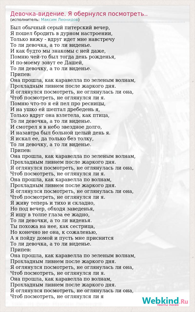 Был обычный серый питерский вечер, Я пошел бродить в дурном настроении, Только вижу - вдруг идет мне навстречу То ли девочка, а то ли виденье. И как будто мы знакомы с ней даже, Помню чей-то был тогда день рожденья, И по-моему зовут ее Дашей, То ли девочку, а то ли виденье. Припев: Она прошла, как каравелла по зеленым волнам, Прохладным ливнем после жаркого дня. Я оглянулся посмотреть, не оглянулась ли она, Чтоб посмотреть, не оглянулся ли я. Помню что-то я ей пел про ресницы, И на ушко ей шептал дребедень я, Только вдруг она взлетела, как птица, То ли девочка, а то ли виденье. И смотрел я в небо звездное долго, И назавтра был больной целый день я. Я искал ее, да только без толку, То ли девочку, а то ли виденье. Припев: Она прошла, как каравелла по зеленым волнам, Прохладным ливнем после жаркого дня. Я оглянулся посмотреть, не оглянулась ли она, Чтоб посмотреть, не оглянулся ли я. Она прошла, как каравелла по волнам, Прохладным ливнем после жаркого дня. Я оглянулся посмотреть, не оглянулась ли она, Чтоб посмотреть, не оглянулся ли я. Я живу теперь и тихо и складно, Но под вечер, обходя заведенья, Я ищу в толпе глаза ее жадно, То ли девочки, а то ли виденья. Ты похожа на нее, как сестрица, Но конечно не она, к сожаленью, А я пойду домой и пусть мне приснится То ли девочка, а то ли виденье. Припев: Она прошла, как каравелла по зеленым волнам, Прохладным ливнем после жаркого дня. Я оглянулся посмотреть, не оглянулась ли она, Чтоб посмотреть, не оглянулся ли я. Она прошла, как каравелла по волнам, Прохладным ливнем после жаркого дня. Я оглянулся посмотреть, не оглянулась ли она, Чтоб посмотреть, не оглянулся ли я