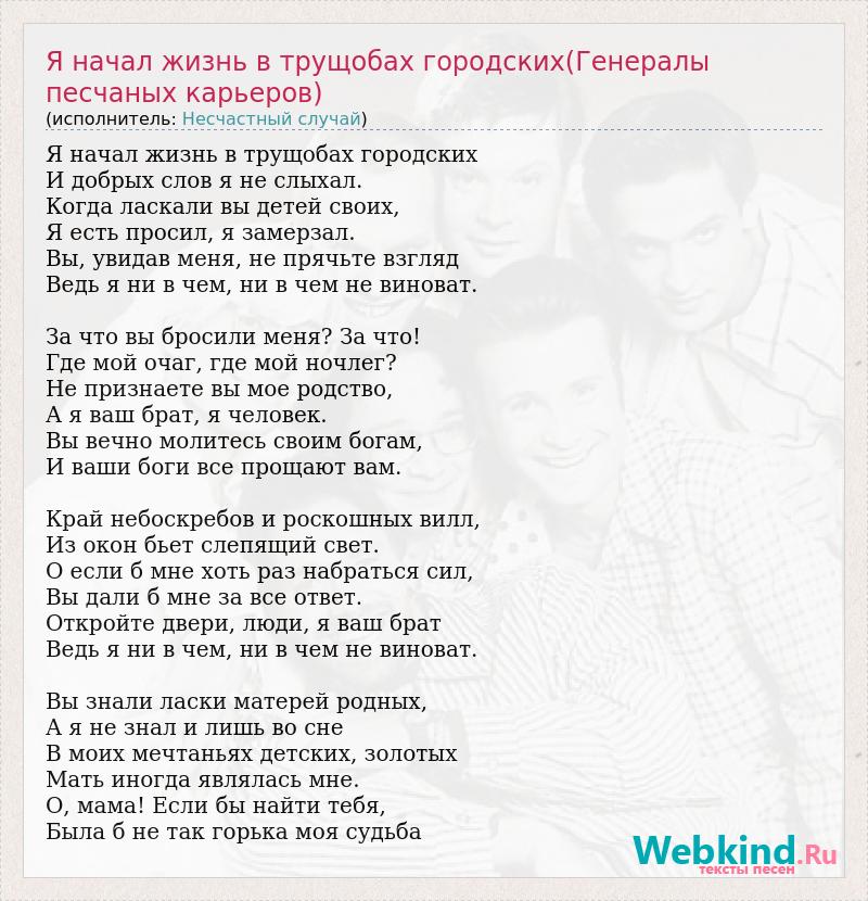 Главная→Исполнители→Несчастный Случай→Я начал жизнь в трущобах городских(Генералы песчаных карьеров)