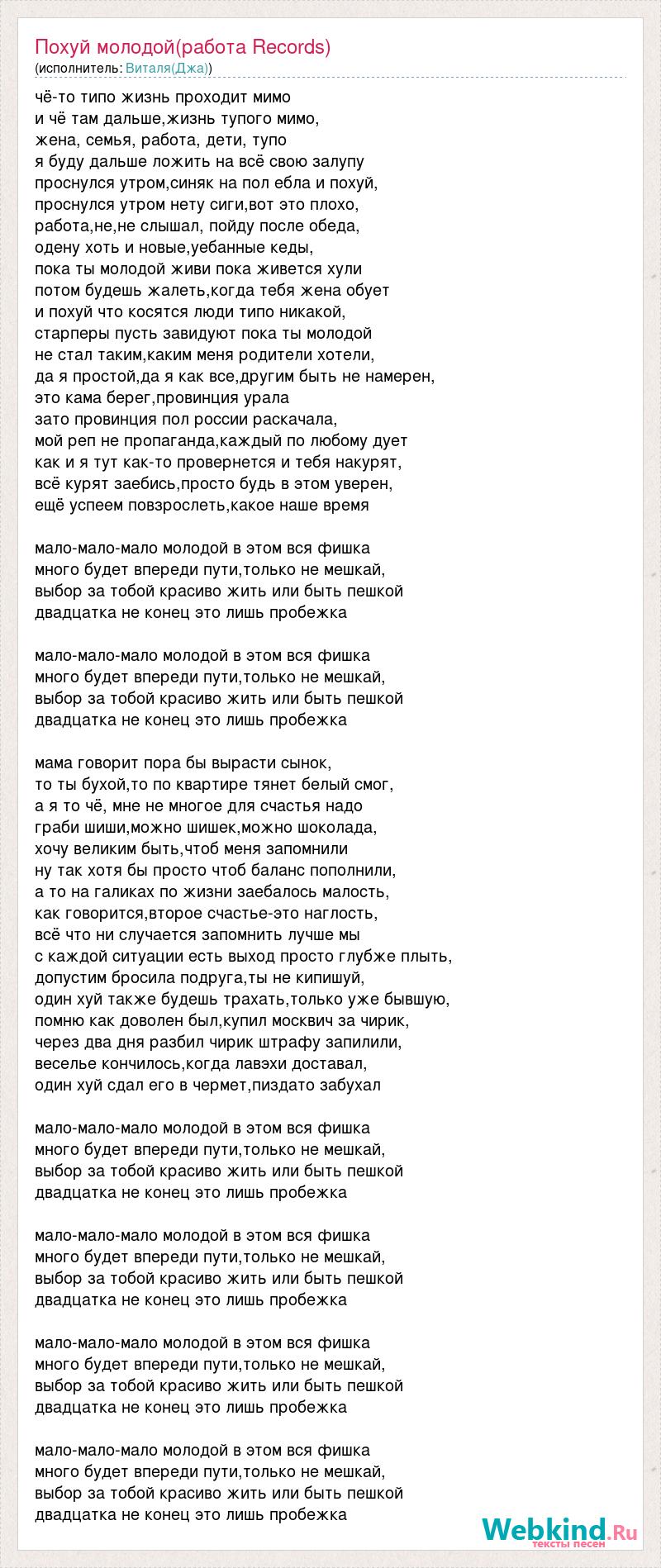 чё-то типо жизнь проходит мимо и чё там дальше,жизнь тупого мимо, жена, семья, работа, дети, тупо я буду дальше ложить на всё свою залупу проснулся утром,синяк на пол ебла и похуй, проснулся утром нету сиги,вот это плохо, работа,не,не слышал, пойду после обеда, одену хоть и новые,уебанные кеды, пока ты молодой живи пока живется хули потом будешь жалеть,когда тебя жена обует и похуй что косятся люди типо никакой, старперы пусть завидуют пока ты молодой не стал таким,каким меня родители хотели, да я простой,да я как все,другим быть не намерен, это кама берег,провинция урала зато провинция пол россии раскачала, мой реп не пропаганда,каждый по любому дует как и я тут как-то провернется и тебя накурят, всё курят заебись,просто будь в этом уверен, ещё успеем повзрослеть,какое наше время мало-мало-мало молодой в этом вся фишка много будет впереди пути,только не мешкай, выбор за тобой красиво жить или быть пешкой двадцатка не конец это лишь пробежка мало-мало-мало молодой в этом вся фишка много будет впереди пути,только не мешкай, выбор за тобой красиво жить или быть пешкой двадцатка не конец это лишь пробежка мама говорит пора бы вырасти сынок, то ты бухой,то по квартире тянет белый смог, а я то чё, мне не многое для счастья надо граби шиши,можно шишек,можно шоколада, хочу великим быть,чтоб меня запомнили ну так хотя бы просто чтоб баланс пополнили, а то на галиках по жизни заебалось малость, как говорится,второе счастье-это наглость, всё что ни случается запомнить лучше мы с каждой ситуации есть выход просто глубже плыть, допустим бросила подруга,ты не кипишуй, один хуй также будешь трахать,только уже бывшую, помню как доволен был,купил москвич за чирик, через два дня разбил чирик штрафу запилили, веселье кончилось,когда лавэхи доставал, один хуй сдал его в чермет,пиздато забухал мало-мало-мало молодой в этом вся фишка много будет впереди пути,только не мешкай, выбор за тобой красиво жить или быть пешкой двадцатка не конец это лишь пробежка мало-мало-мало молодой в этом вся фишка много будет впереди пути,только не мешкай, выбор за тобой красиво жить или быть пешкой двадцатка не конец это лишь пробежка мало-мало-мало молодой в этом вся фишка много будет впереди пути,только не мешкай, выбор за тобой красиво жить или быть пешкой двадцатка не конец это лишь пробежка мало-мало-мало молодой в этом вся фишка много будет впереди пути,только не мешкай, выбор за тобой красиво жить или быть пешкой двадцатка не конец это лишь пробежка