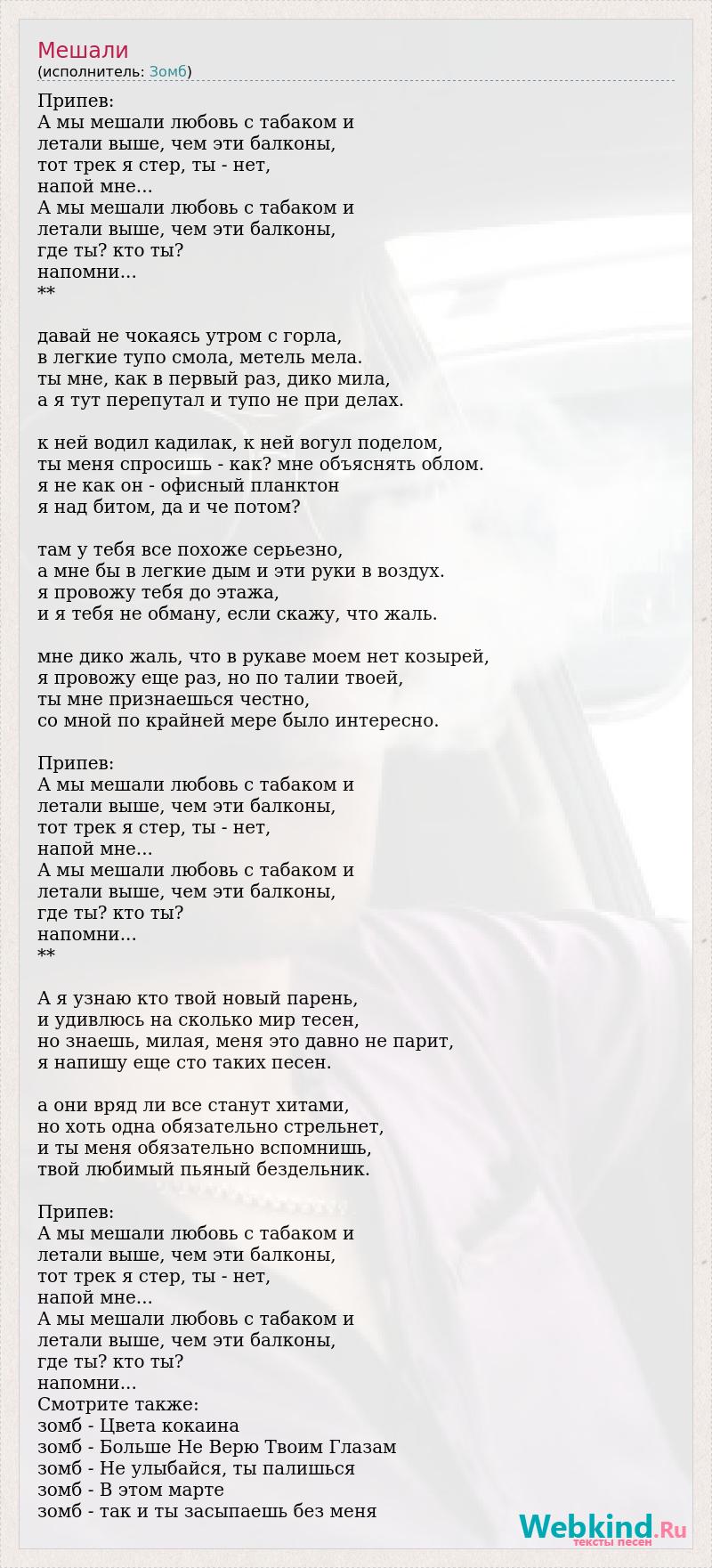 Припев: А мы мешали любовь с табаком и летали выше, чем эти балконы, тот трек я стер, ты - нет, напой мне... А мы мешали любовь с табаком и летали выше, чем эти балконы, где ты? кто ты? напомни... ** давай не чокаясь утром с горла, в легкие тупо смола, метель мела. ты мне, как в первый раз, дико мила, а я тут перепутал и тупо не при делах. к ней водил кадилак, к ней вогул поделом, ты меня спросишь - как? мне объяснять облом. я не как он - офисный планктон я над битом, да и че потом? там у тебя все похоже серьезно, а мне бы в легкие дым и эти руки в воздух. я провожу тебя до этажа, и я тебя не обману, если скажу, что жаль. мне дико жаль, что в рукаве моем нет козырей, я провожу еще раз, но по талии твоей, ты мне признаешься честно, со мной по крайней мере было интересно. Припев: А мы мешали любовь с табаком и летали выше, чем эти балконы, тот трек я стер, ты - нет, напой мне... А мы мешали любовь с табаком и летали выше, чем эти балконы, где ты? кто ты? напомни... ** А я узнаю кто твой новый парень, и удивлюсь на сколько мир тесен, но знаешь, милая, меня это давно не парит, я напишу еще сто таких песен. а они вряд ли все станут хитами, но хоть одна обязательно стрельнет, и ты меня обязательно вспомнишь, твой любимый пьяный бездельник. Припев: А мы мешали любовь с табаком и летали выше, чем эти балконы, тот трек я стер, ты - нет, напой мне... А мы мешали любовь с табаком и летали выше, чем эти балконы, где ты? кто ты? напомни... Смотрите также: зомб - Цвета кокаина зомб - Больше Не Верю Твоим Глазам зомб - Не улыбайся, ты палишься зомб - В этом марте зомб - так и ты засыпаешь без меня