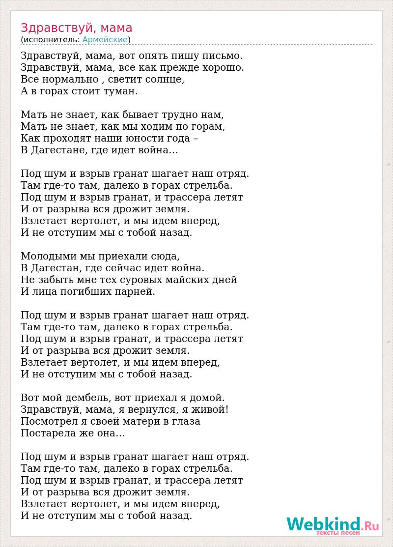Здравствуй, мама, вот опять пишу письмо. Здравствуй, мама, все как прежде хорошо. Все нормально , светит солнце, А в горах стоит туман. Мать не знает, как бывает трудно нам, Мать не знает, как мы ходим по горам, Как проходят наши юности года – В Дагестане, где идет война… Под шум и взрыв гранат шагает наш отряд. Там где-то там, далеко в горах стрельба. Под шум и взрыв гранат, и трассера летят И от разрыва вся дрожит земля. Взлетает вертолет, и мы идем вперед, И не отступим мы с тобой назад. Молодыми мы приехали сюда, В Дагестан, где сейчас идет война. Не забыть мне тех суровых майских дней И лица погибших парней. Под шум и взрыв гранат шагает наш отряд. Там где-то там, далеко в горах стрельба. Под шум и взрыв гранат, и трассера летят И от разрыва вся дрожит земля. Взлетает вертолет, и мы идем вперед, И не отступим мы с тобой назад. Вот мой дембель, вот приехал я домой. Здравствуй, мама, я вернулся, я живой! Посмотрел я своей матери в глаза Постарела же она… Под шум и взрыв гранат шагает наш отряд. Там где-то там, далеко в горах стрельба. Под шум и взрыв гранат, и трассера летят И от разрыва вся дрожит земля. Взлетает вертолет, и мы идем вперед, И не отступим мы с тобой назад.