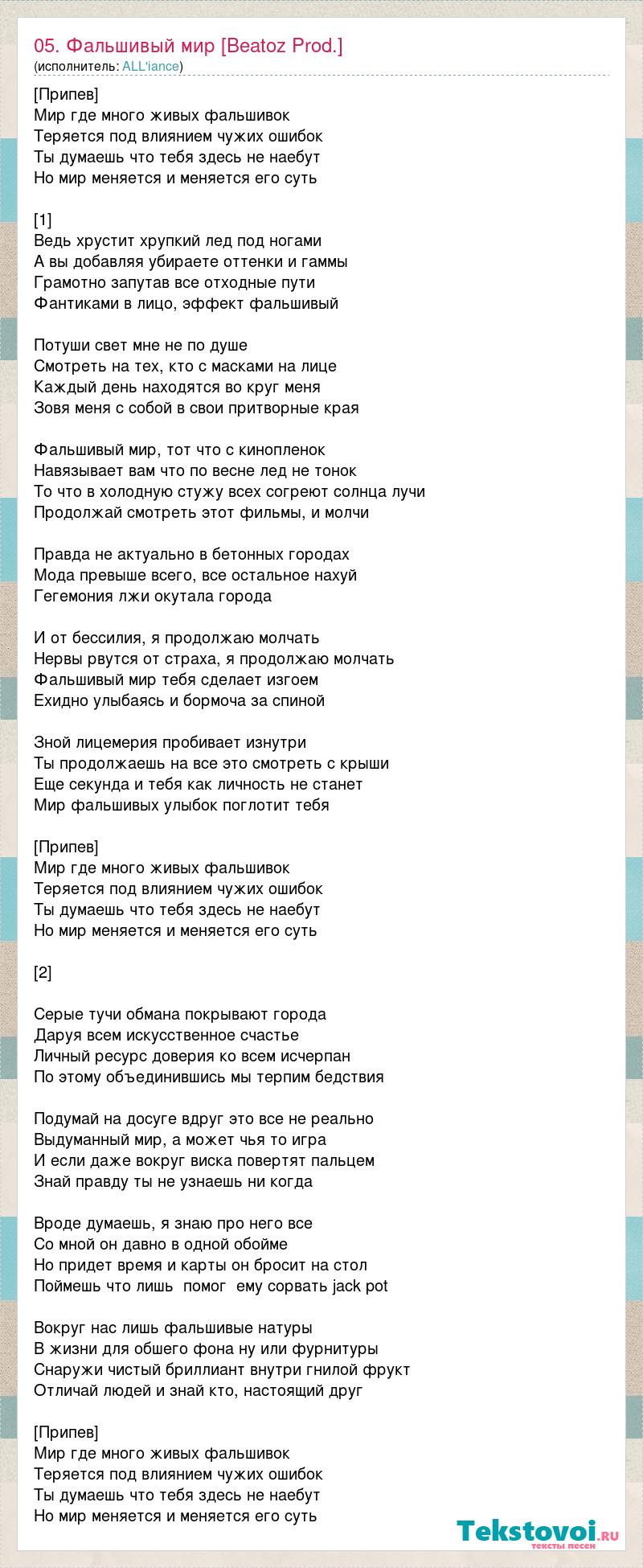 [Припев] Мир где много живых фальшивок Теряется под влиянием чужих ошибок Ты думаешь что тебя здесь не наебут Но мир меняется и меняется его суть [1] Ведь хрустит хрупкий лед под ногами А вы добавляя убираете оттенки и гаммы Грамотно запутав все отходные пути Фантиками в лицо, эффект фальшивый Потуши свет мне не по душе Смотреть на тех, кто с масками на лице Каждый день находятся во круг меня Зовя меня с собой в свои притворные края Фальшивый мир, тот что с кинопленок Навязывает вам что по весне лед не тонок То что в холодную стужу всех согреют солнца лучи Продолжай смотреть этот фильмы, и молчи Правда не актуально в бетонных городах Мода превыше всего, все остальное нахуй Гегемония лжи окутала города И от бессилия, я продолжаю молчать Нервы рвутся от страха, я продолжаю молчать Фальшивый мир тебя сделает изгоем Ехидно улыбаясь и бормоча за спиной Зной лицемерия пробивает изнутри Ты продолжаешь на все это смотреть с крыши Еще секунда и тебя как личность не станет Мир фальшивых улыбок поглотит тебя [Припев] Мир где много живых фальшивок Теряется под влиянием чужих ошибок Ты думаешь что тебя здесь не наебут Но мир меняется и меняется его суть [2] Серые тучи обмана покрывают города Даруя всем искусственное счастье Личный ресурс доверия ко всем исчерпан По этому объединившись мы терпим бедствия Подумай на досуге вдруг это все не реально Выдуманный мир, а может чья то игра И если даже вокруг виска повертят пальцем Знай правду ты не узнаешь ни когда Вроде думаешь, я знаю про него все Со мной он давно в одной обойме Но придет время и карты он бросит на стол Поймешь что лишь помог ему сорвать jack pot Вокруг нас лишь фальшивые натуры В жизни для обшего фона ну или фурнитуры Снаружи чистый бриллиант внутри гнилой фрукт Отличай людей и знай кто, настоящий друг [Припев] Мир где много живых фальшивок Теряется под влиянием чужих ошибок Ты думаешь что тебя здесь не наебут Но мир меняется и меняется его суть