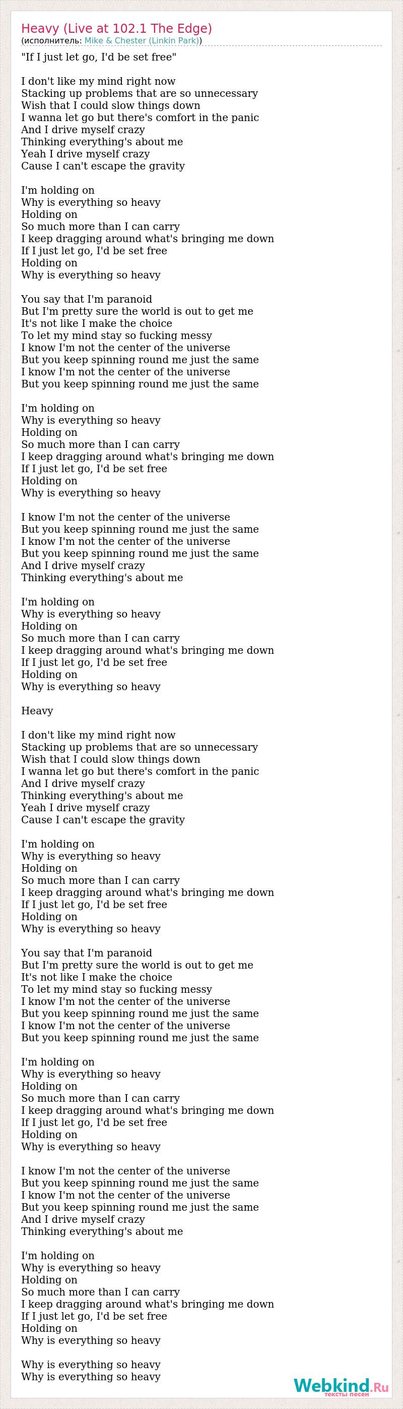 "If I just let go, I'd be set free" I don't like my mind right now Stacking up problems that are so unnecessary Wish that I could slow things down I wanna let go but there's comfort in the panic And I drive myself crazy Thinking everything's about me Yeah I drive myself crazy Cause I can't escape the gravity I'm holding on Why is everything so heavy Holding on So much more than I can carry I keep dragging around what's bringing me down If I just let go, I'd be set free Holding on Why is everything so heavy You say that I'm paranoid But I'm pretty sure the world is out to get me It's not like I make the choice To let my mind stay so fucking messy I know I'm not the center of the universe But you keep spinning round me just the same I know I'm not the center of the universe But you keep spinning round me just the same I'm holding on Why is everything so heavy Holding on So much more than I can carry I keep dragging around what's bringing me down If I just let go, I'd be set free Holding on Why is everything so heavy I know I'm not the center of the universe But you keep spinning round me just the same I know I'm not the center of the universe But you keep spinning round me just the same And I drive myself crazy Thinking everything's about me I'm holding on Why is everything so heavy Holding on So much more than I can carry I keep dragging around what's bringing me down If I just let go, I'd be set free Holding on Why is everything so heavy Heavy I don't like my mind right now Stacking up problems that are so unnecessary Wish that I could slow things down I wanna let go but there's comfort in the panic And I drive myself crazy Thinking everything's about me Yeah I drive myself crazy Cause I can't escape the gravity I'm holding on Why is everything so heavy Holding on So much more than I can carry I keep dragging around what's bringing me down If I just let go, I'd be set free Holding on Why is everything so heavy You say that I'm paranoid But I'm pretty sure the world is out to get me It's not like I make the choice To let my mind stay so fucking messy I know I'm not the center of the universe But you keep spinning round me just the same I know I'm not the center of the universe But you keep spinning round me just the same I'm holding on Why is everything so heavy Holding on So much more than I can carry I keep dragging around what's bringing me down If I just let go, I'd be set free Holding on Why is everything so heavy I know I'm not the center of the universe But you keep spinning round me just the same I know I'm not the center of the universe But you keep spinning round me just the same And I drive myself crazy Thinking everything's about me I'm holding on Why is everything so heavy Holding on So much more than I can carry I keep dragging around what's bringing me down If I just let go, I'd be set free Holding on Why is everything so heavy Why is everything so heavy Why is everything so heavy