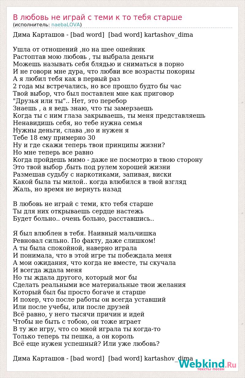 Дима Карташов - [bad word] [bad word] kartashov_dima Ушла от отношений ,но на шее ошейник Растоптав мою любовь , ты выбрала деньги Можешь называть себя блядью и сниматься в порно И не говори мне дура, что любви все возрасты покорны А я любил тебя как в первый раз 2 года мы встречались, но все прошло будто бы час Твой выбор, что был поставлен мне как приговор "Друзья или ты".. Нет, это перебор Знаешь , а я ведь знаю, что ты замерзаешь Когда ты с ним глаза закрываешь, ты меня представляешь Ненавидишь себя, но тебе нужна семья Нужны деньги, слава ,но и нужен я Тебе 18 ему примерно 30 Ну и где скажи теперь твои принципы жизни? Но мне теперь все равно Когда пройдешь мимо - даже не посмотрю в твою сторону Это твой выбор ,быть под рулем хорошей жизни Размешав судьбу с наркотиками, запивая, виски Какой была ты милой.. когда влюбился в твой взгляд Жаль, но время не вернуть назад В любовь не играй с теми, кто тебя старше Ты для них открываешь сердце настежь Будет больно.. очень больно, расставшись.. Я был влюблен в тебя. Наивный мальчишка Ревновал сильно. По факту, даже слишком! А ты была спокойной, наверно играла И понимала, что в этой игре ты побеждала меня А мои ожидания, что когда не вместе, ты скучала И всегда ждала меня Но ты ждала другого, который мог бы Сделать реальными все материальные твои желания Который был бы просто богаче и старше И похер, что после работы он всегда уставший Или после учебы, или после друзей Всё равно, у него тысячи причин и идей Чтобы не быть с тобою, он тоже играет В ту же игру, что со мной играла ты когда-то Только теперь ты пешка, а он король Всё еще нужен успешный? Или уже любовь? Дима Карташов - [bad word] [bad word] kartashov_dima