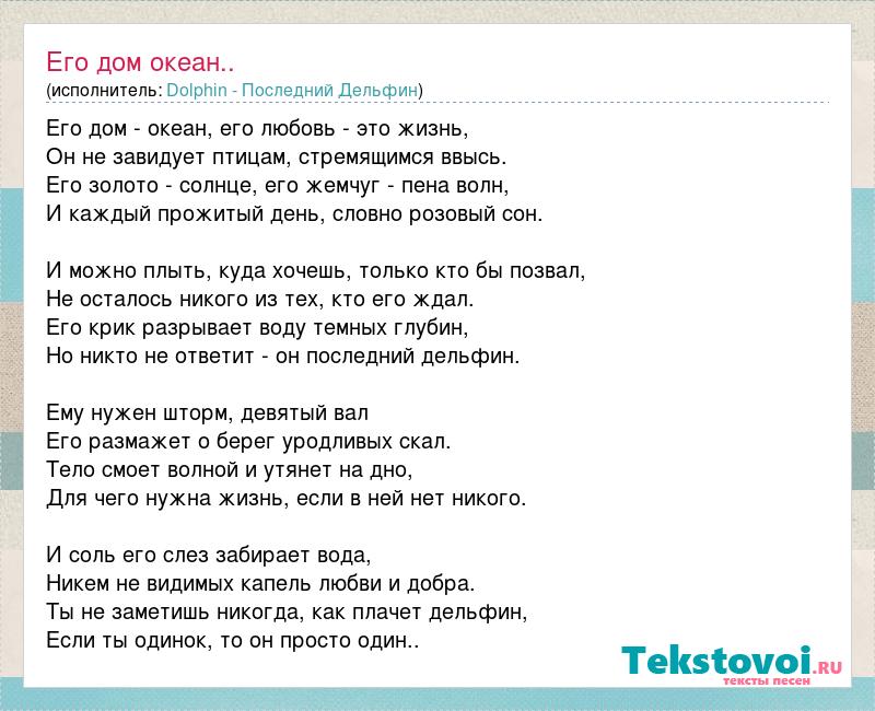 Его дом - океан, его любовь - это жизнь, Он не завидует птицам, стремящимся ввысь. Его золото - солнце, его жемчуг - пена волн, И каждый прожитый день, словно розовый сон. И можно плыть, куда хочешь, только кто бы позвал, Не осталось никого из тех, кто его ждал. Его крик разрывает воду темных глубин, Но никто не ответит - он последний дельфин. Ему нужен шторм, девятый вал Его размажет о берег уродливых скал. Тело смоет волной и утянет на дно, Для чего нужна жизнь, если в ней нет никого. И соль его слез забирает вода, Никем не видимых капель любви и добра. Ты не заметишь никогда, как плачет дельфин, Если ты одинок, то он просто один..