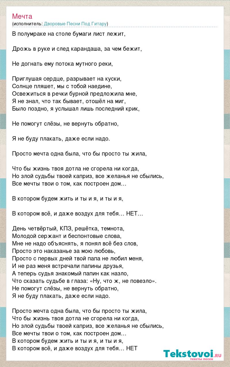 В полумраке на столе бумаги лист лежит, Дрожь в руке и след карандаша, за чем бежит, Не догнать ему потока мутного реки, Приглушая сердце, разрывает на куски, Солнце пляшет, мы с тобой наедине, Освежиться в речки бурной предложила мне, Я не знал, что так бывает, отошёл на миг, Было поздно, я услышал лишь последний крик, Не помогут слёзы, не вернуть обратно, Я не буду плакать, даже если надо. Просто мечта одна была, что бы просто ты жила, Что бы жизнь твоя дотла не сгорела ни когда, Но злой судьбы твоей каприз, все желанья не сбылись, Все мечты твои о том, как построен дом… В котором будем жить и ты и я, и ты и я, В котором всё, и даже воздух для тебя… НЕТ… День четвёртый, КПЗ, решётка, темнота, Молодой сержант и беспонтовые слова, Мне не надо объяснять, я понял всё без слов, Просто это наказанье за мою любовь, Просто с первых дней твой папа не любил меня, И не раз меня встречали папины друзья, А теперь судья знакомый папин как назло, Что сказать судьбе в глаза: «Ну, что ж, не повезло». Не помогут слёзы, не вернуть обратно, Я не буду плакать, даже если надо. Просто мечта одна была, что бы просто ты жила, Что бы жизнь твоя дотла не сгорела ни когда, Но злой судьбы твоей каприз, все желанья не сбылись, Все мечты твои о том, как построен дом… В котором будем жить и ты и я, и ты и я, В котором всё, и даже воздух для тебя… НЕТ