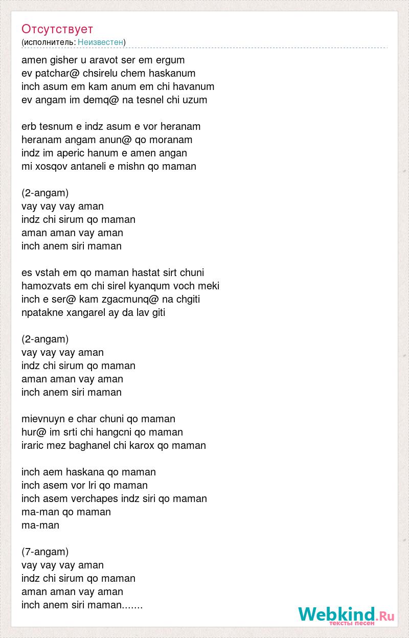 amen gisher u aravot ser em ergum ev patchar@ chsirelu chem haskanum inch asum em kam anum em chi havanum ev angam im demq@ na tesnel chi uzum erb tesnum e indz asum e vor heranam heranam angam anun@ qo moranam indz im aperic hanum e amen angan mi xosqov antaneli e mishn qo maman (2-angam) vay vay vay aman indz chi sirum qo maman aman aman vay aman inch anem siri maman es vstah em qo maman hastat sirt chuni hamozvats em chi sirel kyanqum voch meki inch e ser@ kam zgacmunq@ na chgiti npatakne xangarel ay da lav giti (2-angam) vay vay vay aman indz chi sirum qo maman aman aman vay aman inch anem siri maman mievnuyn e char chuni qo maman hur@ im srti chi hangcni qo maman iraric mez baghanel chi karox qo maman inch aem haskana qo maman inch asem vor lri qo maman inch asem verchapes indz siri qo maman ma-man qo maman ma-man (7-angam) vay vay vay aman indz chi sirum qo maman aman aman vay aman inch anem siri maman.......