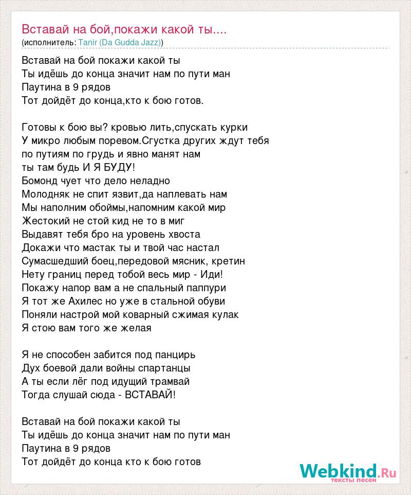 Вставай на бой покажи какой ты Ты идёшь до конца значит нам по пути ман Паутина в 9 рядов Тот дойдёт до конца,кто к бою готов. Готовы к бою вы? кровью лить,спускать курки У микро любым поревом.Сгустка других ждут тебя по путиям по грудь и явно манят нам ты там будь И Я БУДУ! Бомонд чует что дело неладно Молодняк не спит язвит,да наплевать нам Мы наполним обоймы,напомним какой мир Жестокий не стой кид не то в миг Выдавят тебя бро на уровень хвоста Докажи что мастак ты и твой час настал Сумасшедший боец,передовой мясник, кретин Нету границ перед тобой весь мир - Иди! Покажу напор вам а не спальный паппури Я тот же Ахилес но уже в стальной обуви Поняли настрой мой коварный сжимая кулак Я стою вам того же желая Я не способен забится под панцирь Дух боевой дали войны спартанцы А ты если лёг под идущий трамвай Тогда слушай сюда - ВСТАВАЙ! Вставай на бой покажи какой ты Ты идёшь до конца значит нам по пути ман Паутина в 9 рядов Тот дойдёт до конца кто к бою готов