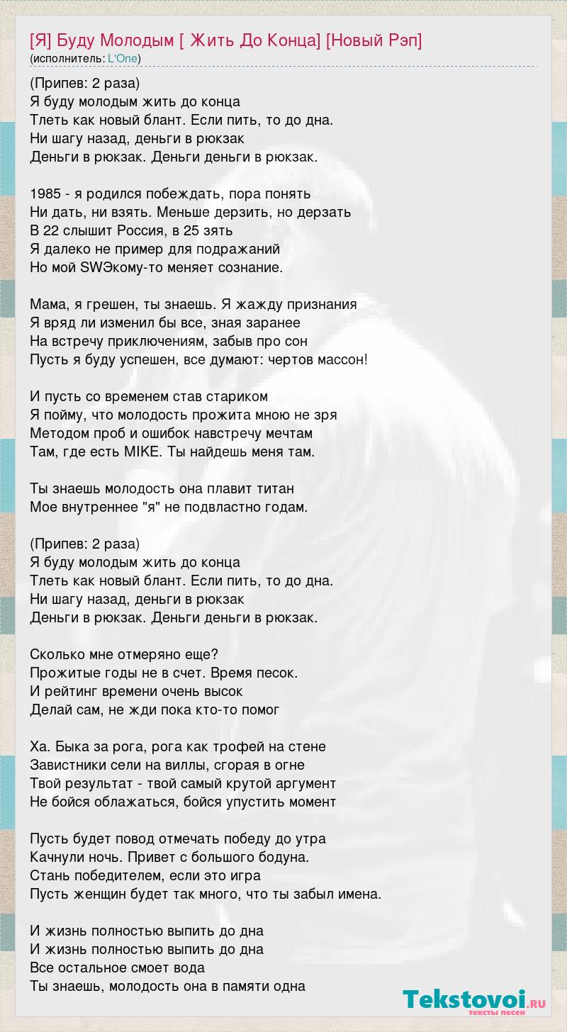 (Припев: 2 раза) Я буду молодым жить до конца Тлеть как новый блант. Если пить, то до дна. Ни шагу назад, деньги в рюкзак Деньги в рюкзак. Деньги деньги в рюкзак. 1985 - я родился побеждать, пора понять Ни дать, ни взять. Меньше дерзить, но дерзать В 22 слышит Россия, в 25 зять Я далеко не пример для подражаний Но мой SWЭкому-то меняет сознание. Мама, я грешен, ты знаешь. Я жажду признания Я вряд ли изменил бы все, зная заранее На встречу приключениям, забыв про сон Пусть я буду успешен, все думают: чертов массон! И пусть со временем став стариком Я пойму, что молодость прожита мною не зря Методом проб и ошибок навстречу мечтам Там, где есть MIKE. Ты найдешь меня там. Ты знаешь молодость она плавит титан Мое внутреннее "я" не подвластно годам. (Припев: 2 раза) Я буду молодым жить до конца Тлеть как новый блант. Если пить, то до дна. Ни шагу назад, деньги в рюкзак Деньги в рюкзак. Деньги деньги в рюкзак. Сколько мне отмеряно еще? Прожитые годы не в счет. Время песок. И рейтинг времени очень высок Делай сам, не жди пока кто-то помог Ха. Быка за рога, рога как трофей на стене Завистники сели на виллы, сгорая в огне Твой результат - твой самый крутой аргумент Не бойся облажаться, бойся упустить момент Пусть будет повод отмечать победу до утра Качнули ночь. Привет с большого бодуна. Стань победителем, если это игра Пусть женщин будет так много, что ты забыл имена. И жизнь полностью выпить до дна И жизнь полностью выпить до дна Все остальное смоет вода Ты знаешь, молодость она в памяти одна