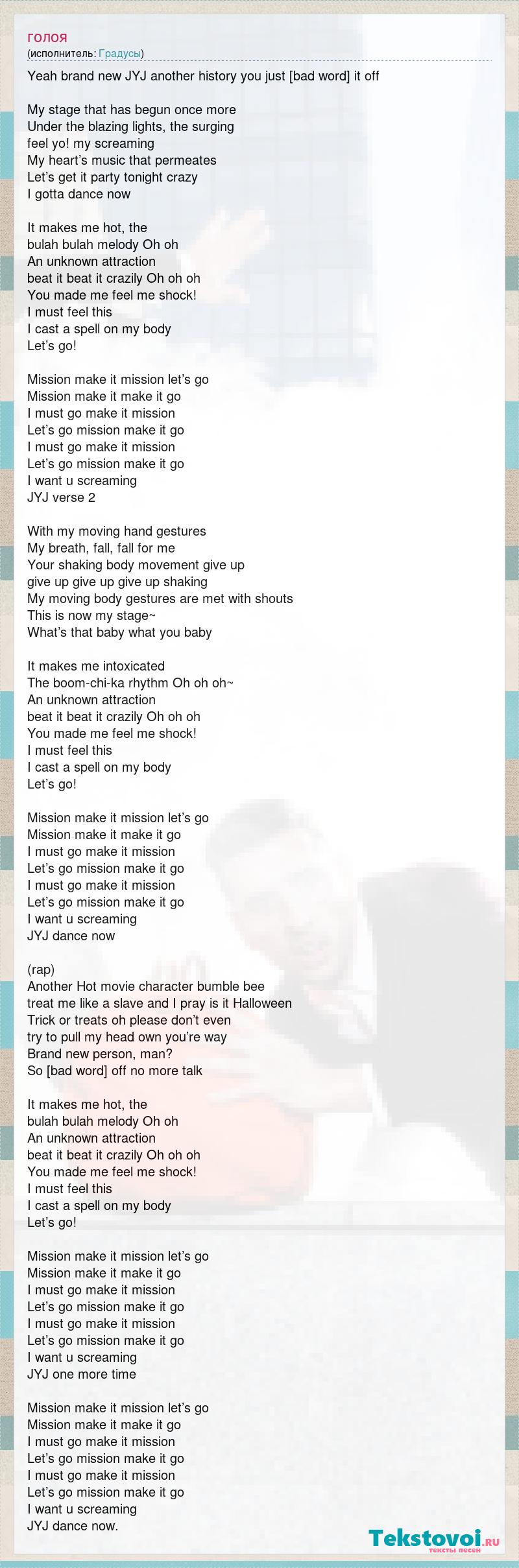 Yeah brand new JYJ another history you just [bad word] it off My stage that has begun once more Under the blazing lights, the surging feel yo! my screaming My heart’s music that permeates Let’s get it party tonight crazy I gotta dance now It makes me hot, the bulah bulah melody Oh oh An unknown attraction beat it beat it crazily Oh oh oh You made me feel me shock! I must feel this I cast a spell on my body Let’s go! Mission make it mission let’s go Mission make it make it go I must go make it mission Let’s go mission make it go I must go make it mission Let’s go mission make it go I want u screaming JYJ verse 2 With my moving hand gestures My breath, fall, fall for me Your shaking body movement give up give up give up give up shaking My moving body gestures are met with shouts This is now my stage~ What’s that baby what you baby It makes me intoxicated The boom-chi-ka rhythm Oh oh oh~ An unknown attraction beat it beat it crazily Oh oh oh You made me feel me shock! I must feel this I cast a spell on my body Let’s go! Mission make it mission let’s go Mission make it make it go I must go make it mission Let’s go mission make it go I must go make it mission Let’s go mission make it go I want u screaming JYJ dance now (rap) Another Hot movie character bumble bee treat me like a slave and I pray is it Halloween Trick or treats oh please don’t even try to pull my head own you’re way Brand new person, man? So [bad word] off no more talk It makes me hot, the bulah bulah melody Oh oh An unknown attraction beat it beat it crazily Oh oh oh You made me feel me shock! I must feel this I cast a spell on my body Let’s go! Mission make it mission let’s go Mission make it make it go I must go make it mission Let’s go mission make it go I must go make it mission Let’s go mission make it go I want u screaming JYJ one more time Mission make it mission let’s go Mission make it make it go I must go make it mission Let’s go mission make it go I must go make it mission Let’s go mission make it go I want u screaming JYJ dance now.