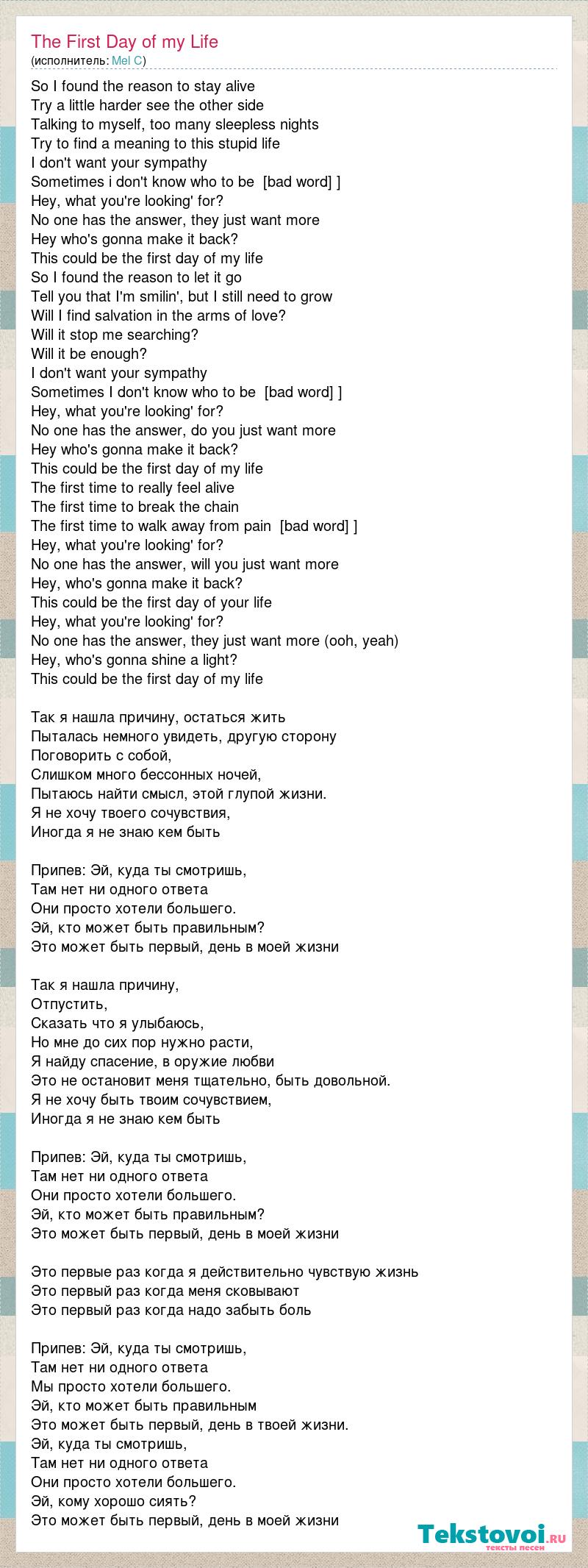 So I found the reason to stay alive Try a little harder see the other side Talking to myself, too many sleepless nights Try to find a meaning to this stupid life I don't want your sympathy Sometimes i don't know who to be [Chorus:] Hey, what you're looking' for? No one has the answer, they just want more Hey who's gonna make it back? This could be the first day of my life So I found the reason to let it go Tell you that I'm smilin', but I still need to grow Will I find salvation in the arms of love? Will it stop me searching? Will it be enough? I don't want your sympathy Sometimes I don't know who to be [Chorus:] Hey, what you're looking' for? No one has the answer, do you just want more Hey who's gonna make it back? This could be the first day of my life The first time to really feel alive The first time to break the chain The first time to walk away from pain [Chorus:] Hey, what you're looking' for? No one has the answer, will you just want more Hey, who's gonna make it back? This could be the first day of your life Hey, what you're looking' for? No one has the answer, they just want more (ooh, yeah) Hey, who's gonna shine a light? This could be the first day of my life Так я нашла причину, остаться жить Пыталась немного увидеть, другую сторону Поговорить с собой, Слишком много бессонных ночей, Пытаюсь найти смысл, этой глупой жизни. Я не хочу твоего сочувствия, Иногда я не знаю кем быть Припев: Эй, куда ты смотришь, Там нет ни одного ответа Они просто хотели большего. Эй, кто может быть правильным? Это может быть первый, день в моей жизни Так я нашла причину, Отпустить, Сказать что я улыбаюсь, Но мне до сих пор нужно расти, Я найду спасение, в оружие любви Это не остановит меня тщательно, быть довольной. Я не хочу быть твоим сочувствием, Иногда я не знаю кем быть Припев: Эй, куда ты смотришь, Там нет ни одного ответа Они просто хотели большего. Эй, кто может быть правильным? Это может быть первый, день в моей жизни Это первые раз когда я действительно чувствую жизнь Это первый раз когда меня сковывают Это первый раз когда надо забыть боль Припев: Эй, куда ты смотришь, Там нет ни одного ответа Мы просто хотели большего. Эй, кто может быть правильным Это может быть первый, день в твоей жизни. Эй, куда ты смотришь, Там нет ни одного ответа Они просто хотели большего. Эй, кому хорошо сиять? Это может быть первый, день в моей жизни