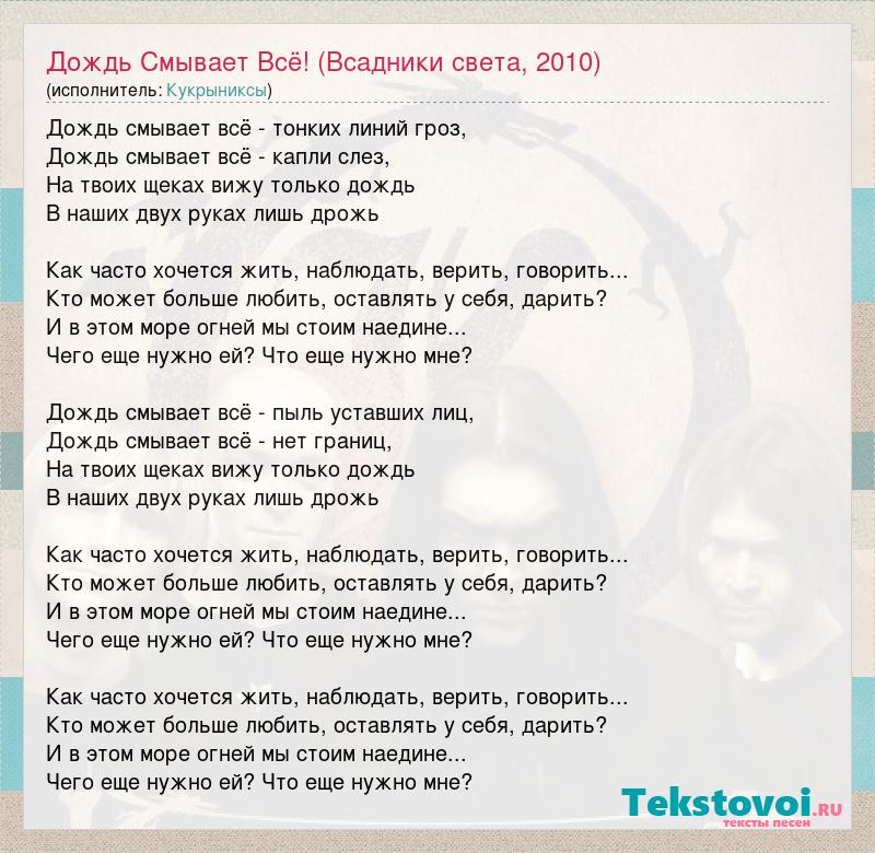 Дождь смывает всё - тонких линий гроз, Дождь смывает всё - капли слез, На твоих щеках вижу только дождь В наших двух руках лишь дрожь Как часто хочется жить, наблюдать, верить, говорить... Кто может больше любить, оставлять у себя, дарить? И в этом море огней мы стоим наедине... Чего еще нужно ей? Что еще нужно мне? Дождь смывает всё - пыль уставших лиц, Дождь смывает всё - нет границ, На твоих щеках вижу только дождь В наших двух руках лишь дрожь Как часто хочется жить, наблюдать, верить, говорить... Кто может больше любить, оставлять у себя, дарить? И в этом море огней мы стоим наедине... Чего еще нужно ей? Что еще нужно мне? Как часто хочется жить, наблюдать, верить, говорить... Кто может больше любить, оставлять у себя, дарить? И в этом море огней мы стоим наедине... Чего еще нужно ей? Что еще нужно мне?