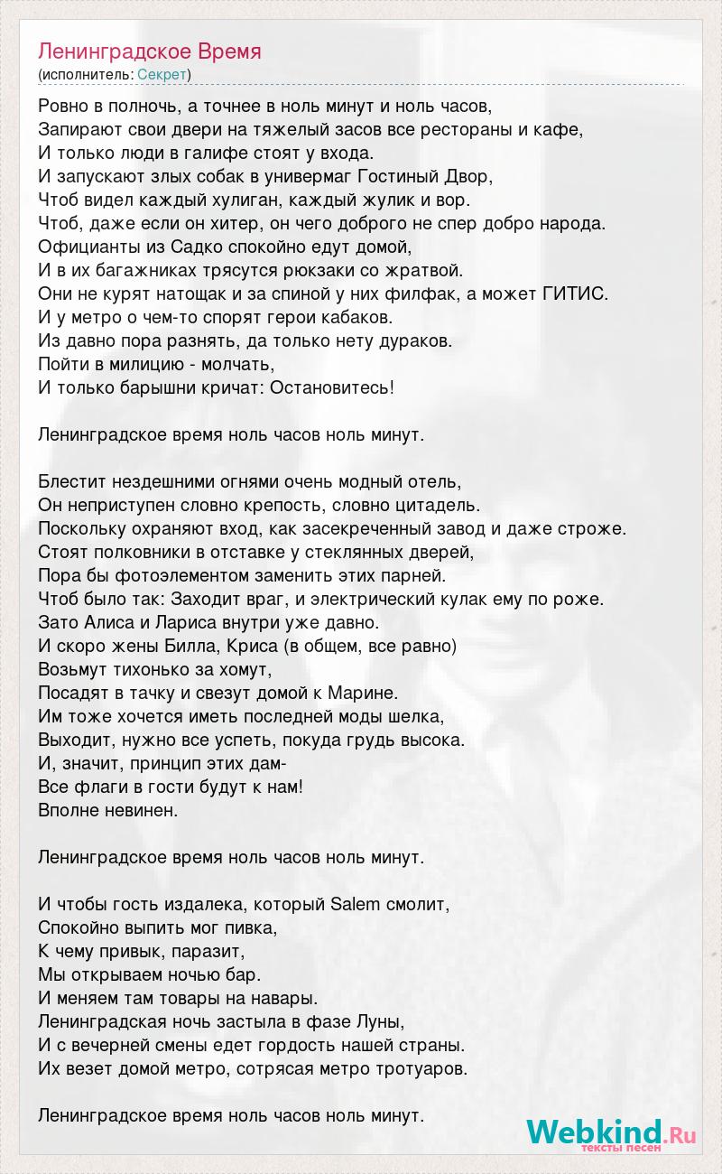 Ровно в полночь, а точнее в ноль минут и ноль часов, Запирают свои двери на тяжелый засов все рестораны и кафе, И только люди в галифе стоят у входа. И запускают злых собак в универмаг Гостиный Двор, Чтоб видел каждый хулиган, каждый жулик и вор. Чтоб, даже если он хитер, он чего доброго не спер добро народа. Официанты из Садко спокойно едут домой, И в их багажниках трясутся рюкзаки со жратвой. Они не курят натощак и за спиной у них филфак, а может ГИТИС. И у метро о чем-то спорят герои кабаков. Из давно пора разнять, да только нету дураков. Пойти в милицию - молчать, И только барышни кричат: Остановитесь! Ленинградское время ноль часов ноль минут. Блестит нездешними огнями очень модный отель, Он неприступен словно крепость, словно цитадель. Поскольку охраняют вход, как засекреченный завод и даже строже. Стоят полковники в отставке у стеклянных дверей, Пора бы фотоэлементом заменить этих парней. Чтоб было так: Заходит враг, и электрический кулак ему по роже. Зато Алиса и Лариса внутри уже давно. И скоро жены Билла, Криса (в общем, все равно) Возьмут тихонько за хомут, Посадят в тачку и свезут домой к Марине. Им тоже хочется иметь последней моды шелка, Выходит, нужно все успеть, покуда грудь высока. И, значит, принцип этих дам- Все флаги в гости будут к нам! Вполне невинен. Ленинградское время ноль часов ноль минут. И чтобы гость издалека, который Salem смолит, Спокойно выпить мог пивка, К чему привык, паразит, Мы открываем ночью бар. И меняем там товары на навары. Ленинградская ночь застыла в фазе Луны, И с вечерней смены едет гордость нашей страны. Их везет домой метро, сотрясая метро тротуаров. Ленинградское время ноль часов ноль минут.