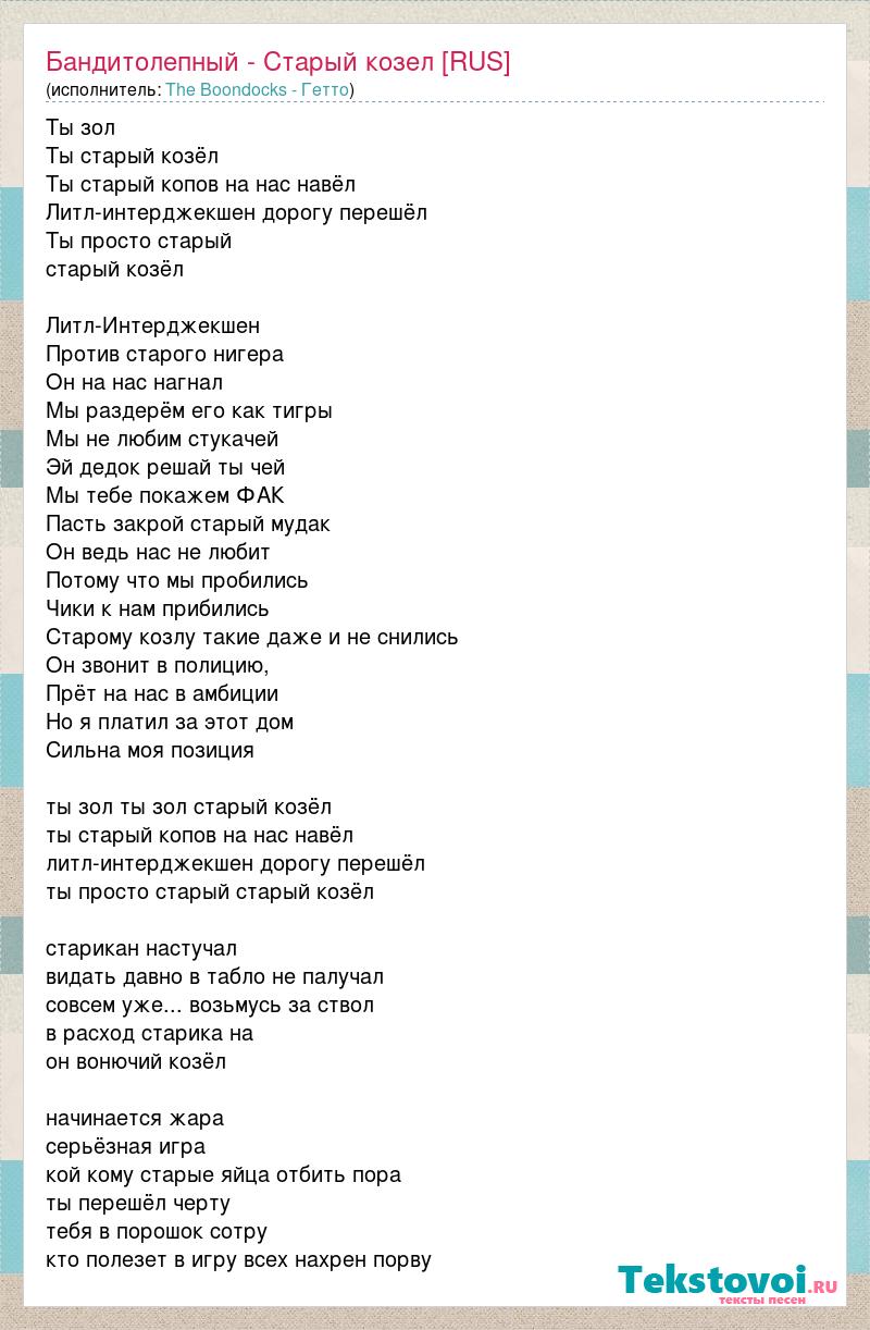Ты зол Ты старый козёл Ты старый копов на нас навёл Литл-интерджекшен дорогу перешёл Ты просто старый старый козёл Литл-Интерджекшен Против старого нигера Он на нас нагнал Мы раздерём его как тигры Мы не любим стукачей Эй дедок решай ты чей Мы тебе покажем ФАК Пасть закрой старый мудак Он ведь нас не любит Потому что мы пробились Чики к нам прибились Старому козлу такие даже и не снились Он звонит в полицию, Прёт на нас в амбиции Но я платил за этот дом Сильна моя позиция ты зол ты зол старый козёл ты старый копов на нас навёл литл-интерджекшен дорогу перешёл ты просто старый старый козёл старикан настучал видать давно в табло не палучал совсем уже... возьмусь за ствол в расход старика на он вонючий козёл начинается жара серьёзная игра кой кому старые яйца отбить пора ты перешёл черту тебя в порошок сотру кто полезет в игру всех нахрен порву