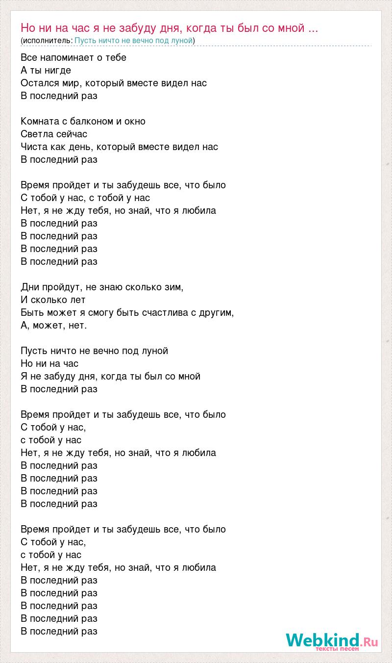 Все напоминает о тебе А ты нигде Остался мир, который вместе видел нас В последний раз Комната с балконом и окно Светла сейчас Чиста как день, который вместе видел нас В последний раз Время пройдет и ты забудешь все, что было С тобой у нас, с тобой у нас Нет, я не жду тебя, но знай, что я любила В последний раз В последний раз В последний раз В последний раз Дни пройдут, не знаю сколько зим, И сколько лет Быть может я смогу быть счастлива с другим, А, может, нет. Пусть ничто не вечно под луной Но ни на час Я не забуду дня, когда ты был со мной В последний раз Время пройдет и ты забудешь все, что было С тобой у нас, с тобой у нас Нет, я не жду тебя, но знай, что я любила В последний раз В последний раз В последний раз В последний раз Время пройдет и ты забудешь все, что было С тобой у нас, с тобой у нас Нет, я не жду тебя, но знай, что я любила В последний раз В последний раз В последний раз В последний раз В последний раз