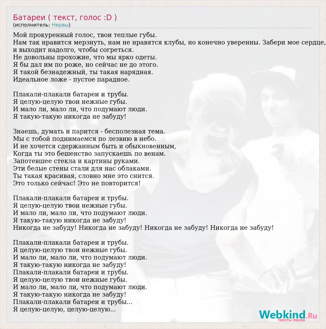 Мой прокуренный голос, твои теплые губы. Нам так нравится мерзнуть, нам не нравятся клубы, но конечно уверенны. Забери мое сердце, и выходит надолго, чтобы согреться. Не довольны прохожие, что мы ярко одеты. Я бы дал им по роже, но сейчас не до этого. Я такой безнадежный, ты такая нарядная. Идеальное ложе - пустое парадное. Плакали-плакали батареи и трубы. Я целую-целую твои нежные губы. И мало ли, мало ли, что подумают люди. Я такую-такую никогда не забуду! Знаешь, думать и парится - бесполезная тема. Мы с тобой поднимаемся по лезвию в небо. И не хочется сдержанным быть и обыкновенным, Когда ты это бешенство запускаешь по венам. Запотевшее стекла и картины руками. Эти белые стены стали для нас облаками. Ты такая красивая, словно мне это снится. Это только сейчас! Это не повторится! Плакали-плакали батареи и трубы. Я целую-целую твои нежные губы. И мало ли, мало ли, что подумают люди. Я такую-такую никогда не забуду! Никогда не забуду! Никогда не забуду! Никогда не забуду! Никогда не забуду! Плакали-плакали батареи и трубы. Я целую-целую твои нежные губы. И мало ли, мало ли, что подумают люди. Я такую-такую никогда не забуду! Плакали-плакали батареи и трубы. Я целую-целую твои нежные губы. И мало ли, мало ли, что подумают люди. Я такую-такую никогда не забуду! Плакали-плакали батареи и трубы... Я целую-целую, целую-целую...