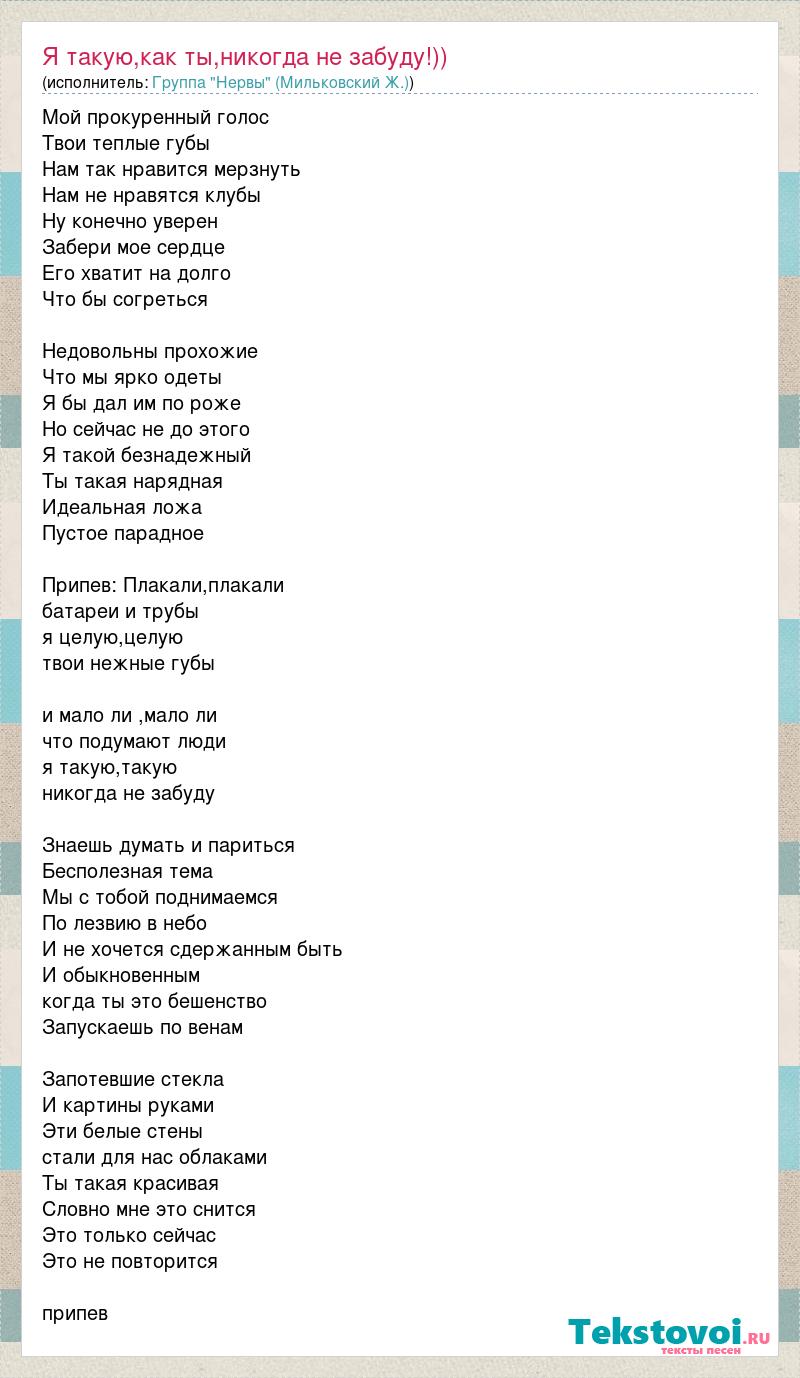 Мой прокуренный голос Твои теплые губы Нам так нравится мерзнуть Нам не нравятся клубы Ну конечно уверен Забери мое сердце Его хватит на долго Что бы согреться Недовольны прохожие Что мы ярко одеты Я бы дал им по роже Но сейчас не до этого Я такой безнадежный Ты такая нарядная Идеальная ложа Пустое парадное Припев: Плакали,плакали батареи и трубы я целую,целую твои нежные губы и мало ли ,мало ли что подумают люди я такую,такую никогда не забуду Знаешь думать и париться Бесполезная тема Мы с тобой поднимаемся По лезвию в небо И не хочется сдержанным быть И обыкновенным когда ты это бешенство Запускаешь по венам Запотевшие стекла И картины руками Эти белые стены стали для нас облаками Ты такая красивая Словно мне это снится Это только сейчас Это не повторится припев