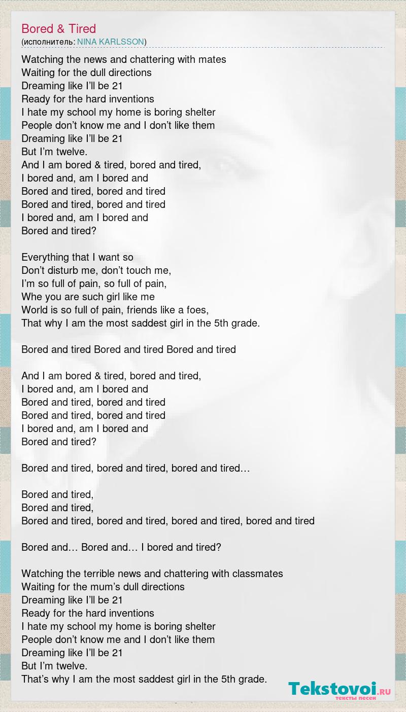 Watching the news and chattering with mates Waiting for the dull directions Dreaming like I’ll be 21 Ready for the hard inventions I hate my school my home is boring shelter People don’t know me and I don’t like them Dreaming like I’ll be 21 But I’m twelve. And I am bored & tired, bored and tired, I bored and, am I bored and Bored and tired, bored and tired Bored and tired, bored and tired I bored and, am I bored and Bored and tired? Everything that I want so Don’t disturb me, don’t touch me, I’m so full of pain, so full of pain, Whe you are such girl like me World is so full of pain, friends like a foes, That why I am the most saddest girl in the 5th grade. Bored and tired Bored and tired Bored and tired And I am bored & tired, bored and tired, I bored and, am I bored and Bored and tired, bored and tired Bored and tired, bored and tired I bored and, am I bored and Bored and tired? Bored and tired, bored and tired, bored and tired… Bored and tired, Bored and tired, Bored and tired, bored and tired, bored and tired, bored and tired Bored and… Bored and… I bored and tired? Watching the terrible news and chattering with classmates Waiting for the mum’s dull directions Dreaming like I’ll be 21 Ready for the hard inventions I hate my school my home is boring shelter People don’t know me and I don’t like them Dreaming like I’ll be 21 But I’m twelve. That’s why I am the most saddest girl in the 5th grade.
