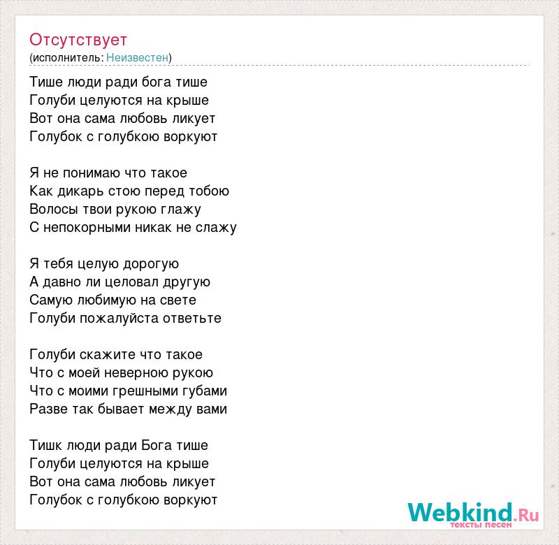 Тише люди ради бога тише Голуби целуются на крыше Вот она сама любовь ликует Голубок с голубкою воркуют Я не понимаю что такое Как дикарь стою перед тобою Волосы твои рукою глажу С непокорными никак не слажу Я тебя целую дорогую А давно ли целовал другую Самую любимую на свете Голуби пожалуйста ответьте Голуби скажите что такое Что с моей неверною рукою Что с моими грешными губами Разве так бывает между вами Тишк люди ради Бога тише Голуби целуются на крыше Вот она сама любовь ликует Голубок с голубкою воркуют