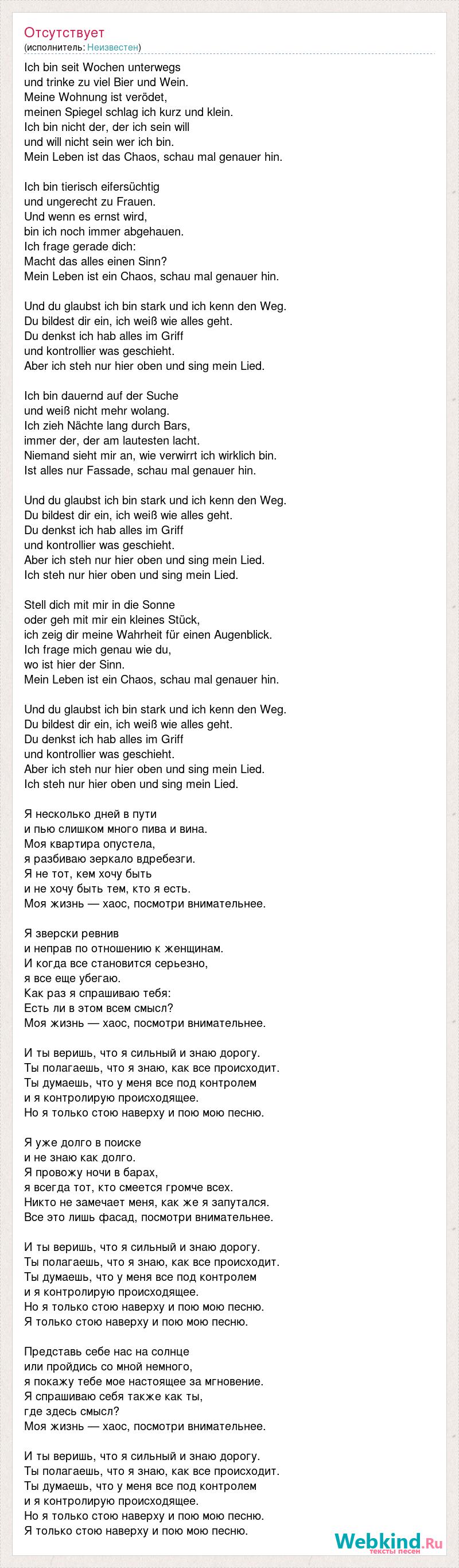 Ich bin seit Wochen unterwegs und trinke zu viel Bier und Wein. Meine Wohnung ist verödet, meinen Spiegel schlag ich kurz und klein. Ich bin nicht der, der ich sein will und will nicht sein wer ich bin. Mein Leben ist das Chaos, schau mal genauer hin. Ich bin tierisch eifersüchtig und ungerecht zu Frauen. Und wenn es ernst wird, bin ich noch immer abgehauen. Ich frage gerade dich: Macht das alles einen Sinn? Mein Leben ist ein Chaos, schau mal genauer hin. Und du glaubst ich bin stark und ich kenn den Weg. Du bildest dir ein, ich weiß wie alles geht. Du denkst ich hab alles im Griff und kontrollier was geschieht. Aber ich steh nur hier oben und sing mein Lied. Ich bin dauernd auf der Suche und weiß nicht mehr wolang. Ich zieh Nächte lang durch Bars, immer der, der am lautesten lacht. Niemand sieht mir an, wie verwirrt ich wirklich bin. Ist alles nur Fassade, schau mal genauer hin. Und du glaubst ich bin stark und ich kenn den Weg. Du bildest dir ein, ich weiß wie alles geht. Du denkst ich hab alles im Griff und kontrollier was geschieht. Aber ich steh nur hier oben und sing mein Lied. Ich steh nur hier oben und sing mein Lied. Stell dich mit mir in die Sonne oder geh mit mir ein kleines Stück, ich zeig dir meine Wahrheit für einen Augenblick. Ich frage mich genau wie du, wo ist hier der Sinn. Mein Leben ist ein Chaos, schau mal genauer hin. Und du glaubst ich bin stark und ich kenn den Weg. Du bildest dir ein, ich weiß wie alles geht. Du denkst ich hab alles im Griff und kontrollier was geschieht. Aber ich steh nur hier oben und sing mein Lied. Ich steh nur hier oben und sing mein Lied. Я несколько дней в пути и пью слишком много пива и вина. Моя квартира опустела, я разбиваю зеркало вдребезги. Я не тот, кем хочу быть и не хочу быть тем, кто я есть. Моя жизнь — хаос, посмотри внимательнее. Я зверски ревнив и неправ по отношению к женщинам. И когда все становится серьезно, я все еще убегаю. Как раз я спрашиваю тебя: Есть ли в этом всем смысл? Моя жизнь — хаос, посмотри внимательнее. И ты веришь, что я сильный и знаю дорогу. Ты полагаешь, что я знаю, как все происходит. Ты думаешь, что у меня все под контролем и я контролирую происходящее. Но я только стою наверху и пою мою песню. Я уже долго в поиске и не знаю как долго. Я провожу ночи в барах, я всегда тот, кто смеется громче всех. Никто не замечает меня, как же я запутался. Все это лишь фасад, посмотри внимательнее. И ты веришь, что я сильный и знаю дорогу. Ты полагаешь, что я знаю, как все происходит. Ты думаешь, что у меня все под контролем и я контролирую происходящее. Но я только стою наверху и пою мою песню. Я только стою наверху и пою мою песню. Представь себе нас на солнце или пройдись со мной немного, я покажу тебе мое настоящее за мгновение. Я спрашиваю себя также как ты, где здесь смысл? Моя жизнь — хаос, посмотри внимательнее. И ты веришь, что я сильный и знаю дорогу. Ты полагаешь, что я знаю, как все происходит. Ты думаешь, что у меня все под контролем и я контролирую происходящее. Но я только стою наверху и пою мою песню. Я только стою наверху и пою мою песню.